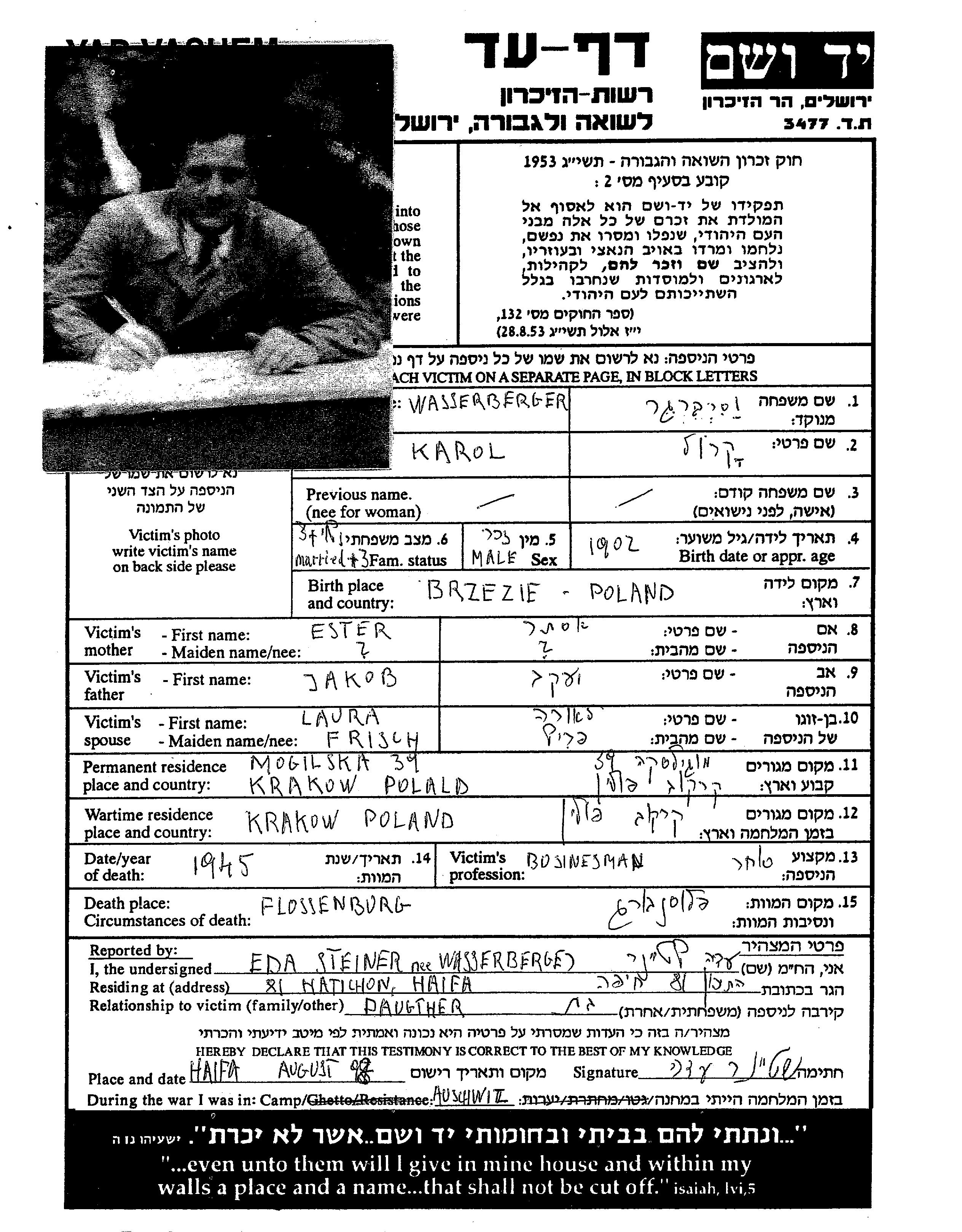 Karol Wasserberger was born in Brzezie, Poland, 1902. He was a merchant. Prior to WWII he lived in Krakow, Poland. Karol was murdered in the Shoah. Place of death: Flossenbürg, Germany, 1945.