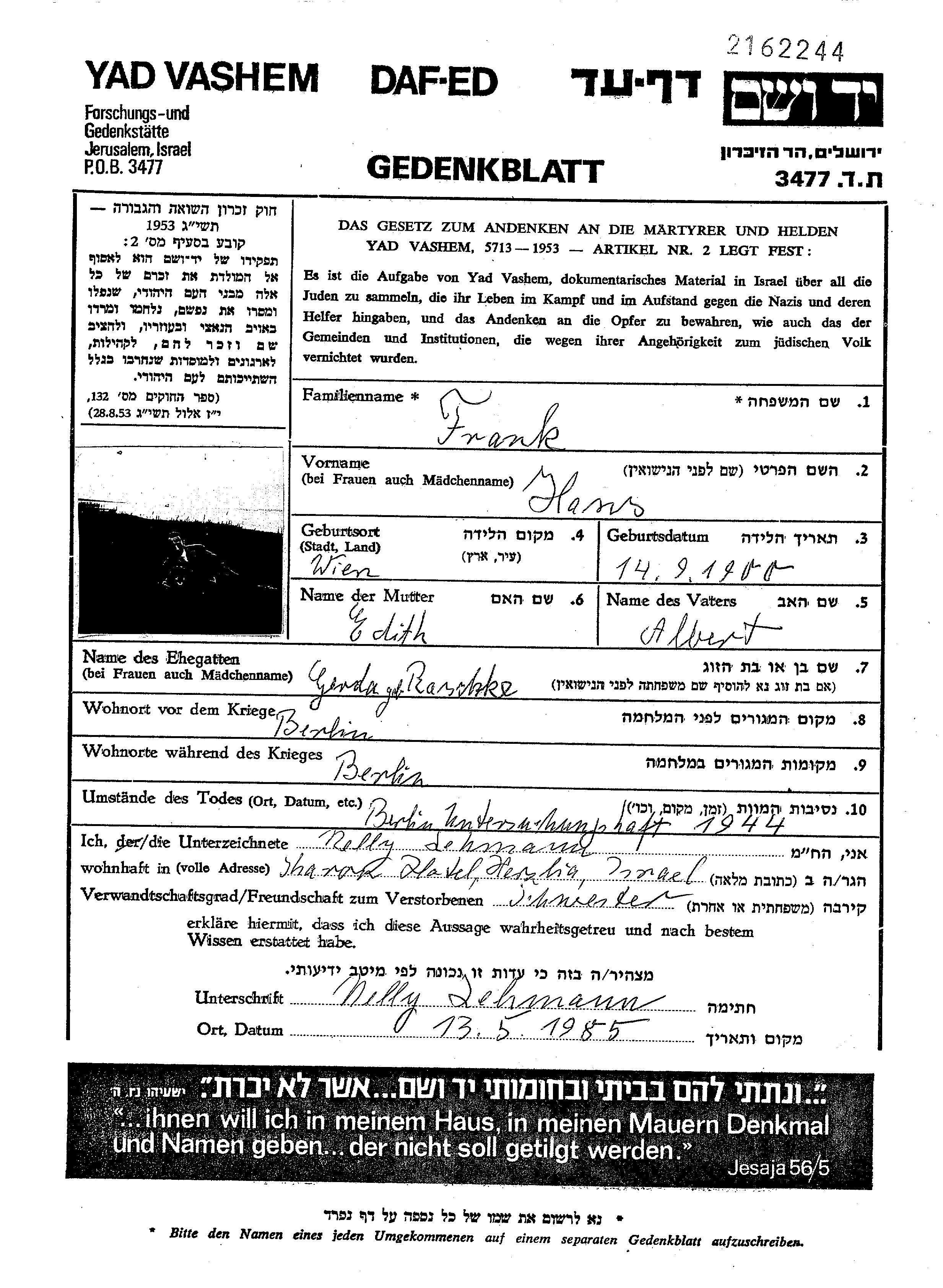 Hans Frank was born in Wien, Austria, 1900. Prior to WWII he lived in Berlin, Germany.