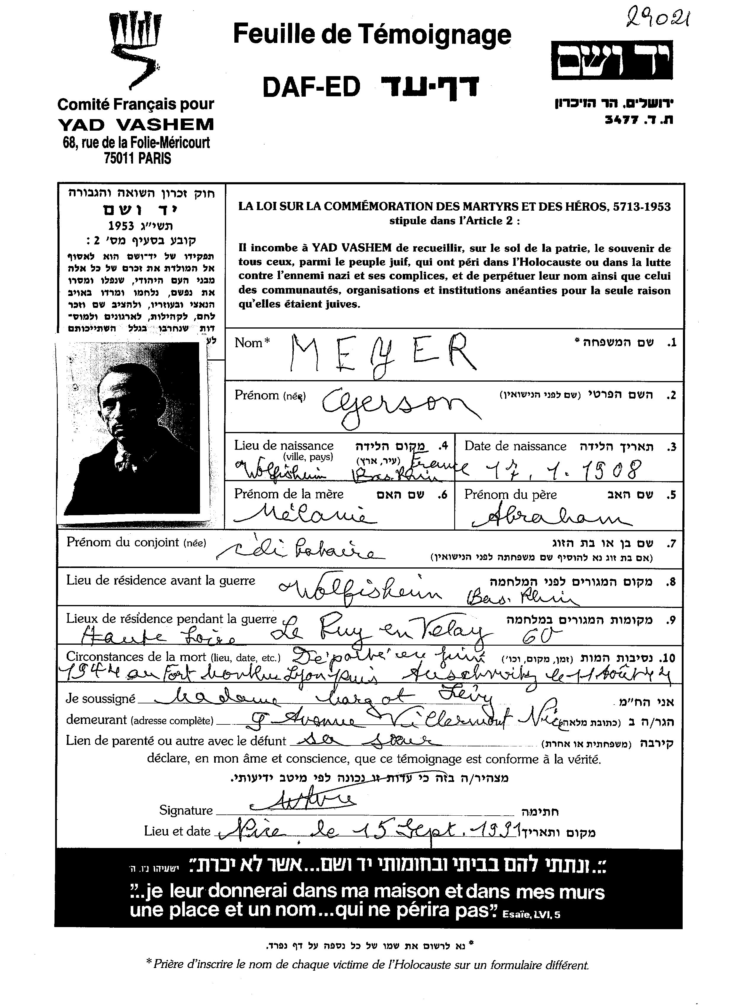 Meyer Gerson 1908 Wolfisheim, France Page of Testimony