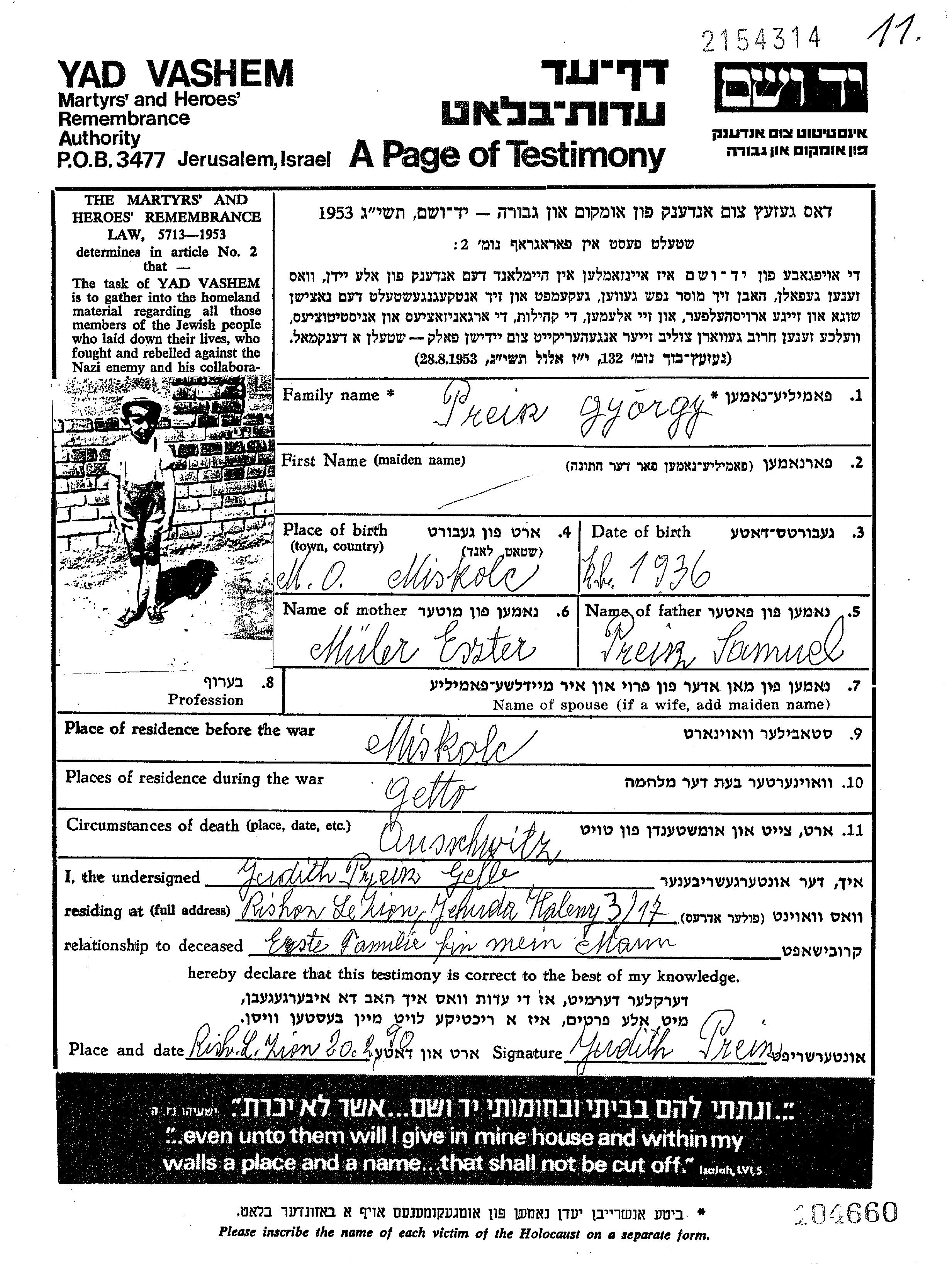Yad Vashem - Pages of Testimony Names Memorial Collection
