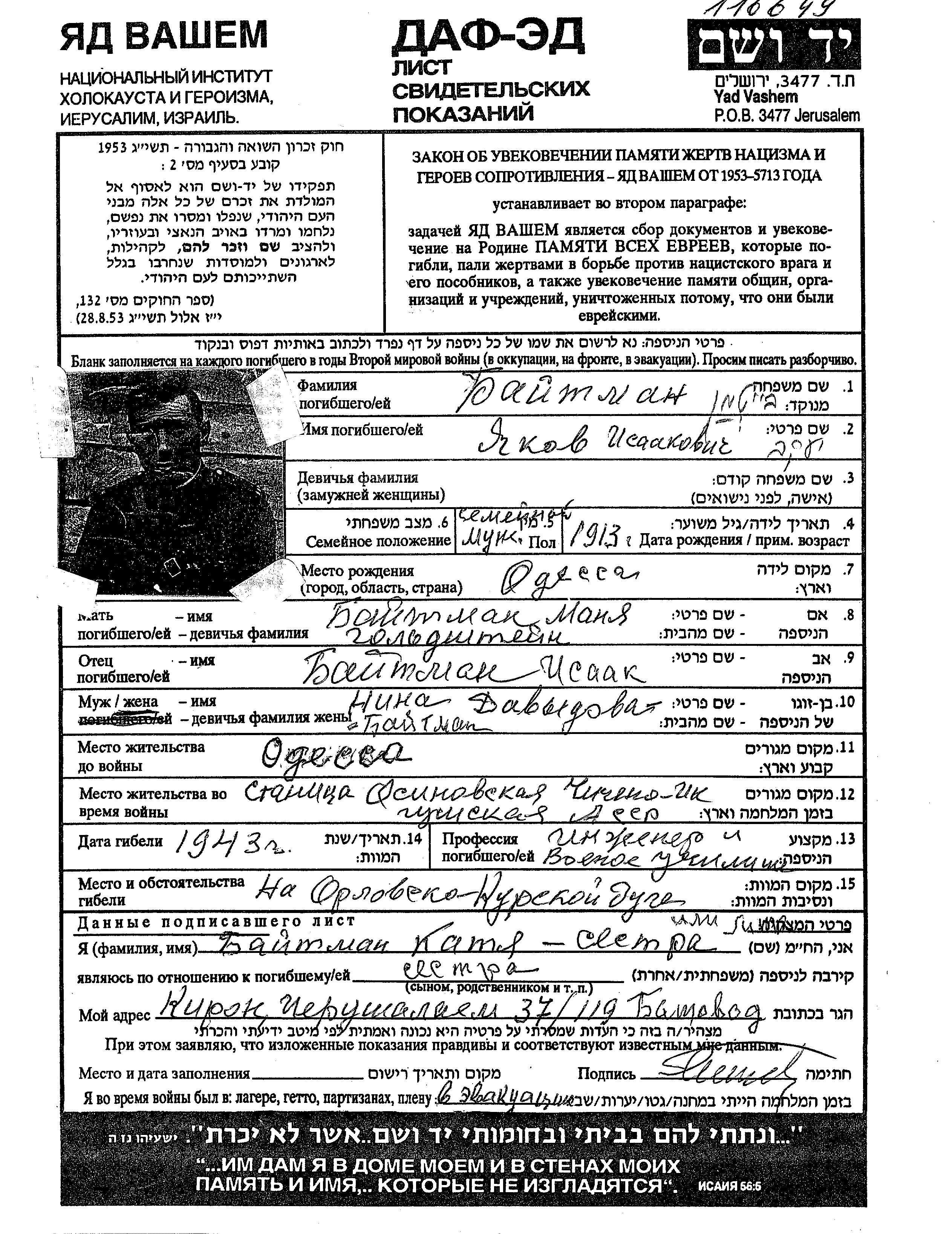Baitman Yakov 1913 Odessa, Ukraine (USSR) Page of Testimony