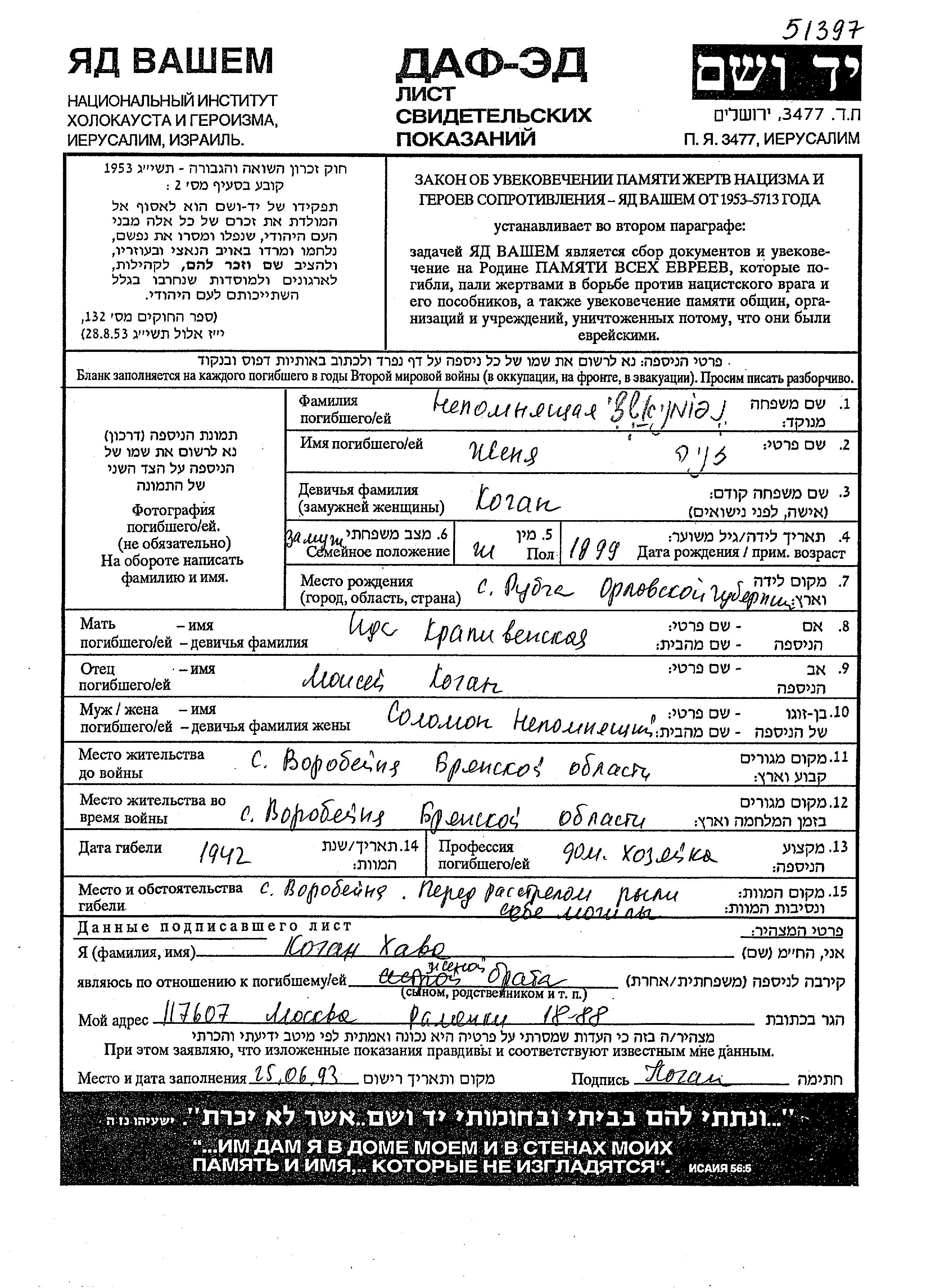 Yad Vashem - Pages of Testimony Names Memorial Collection