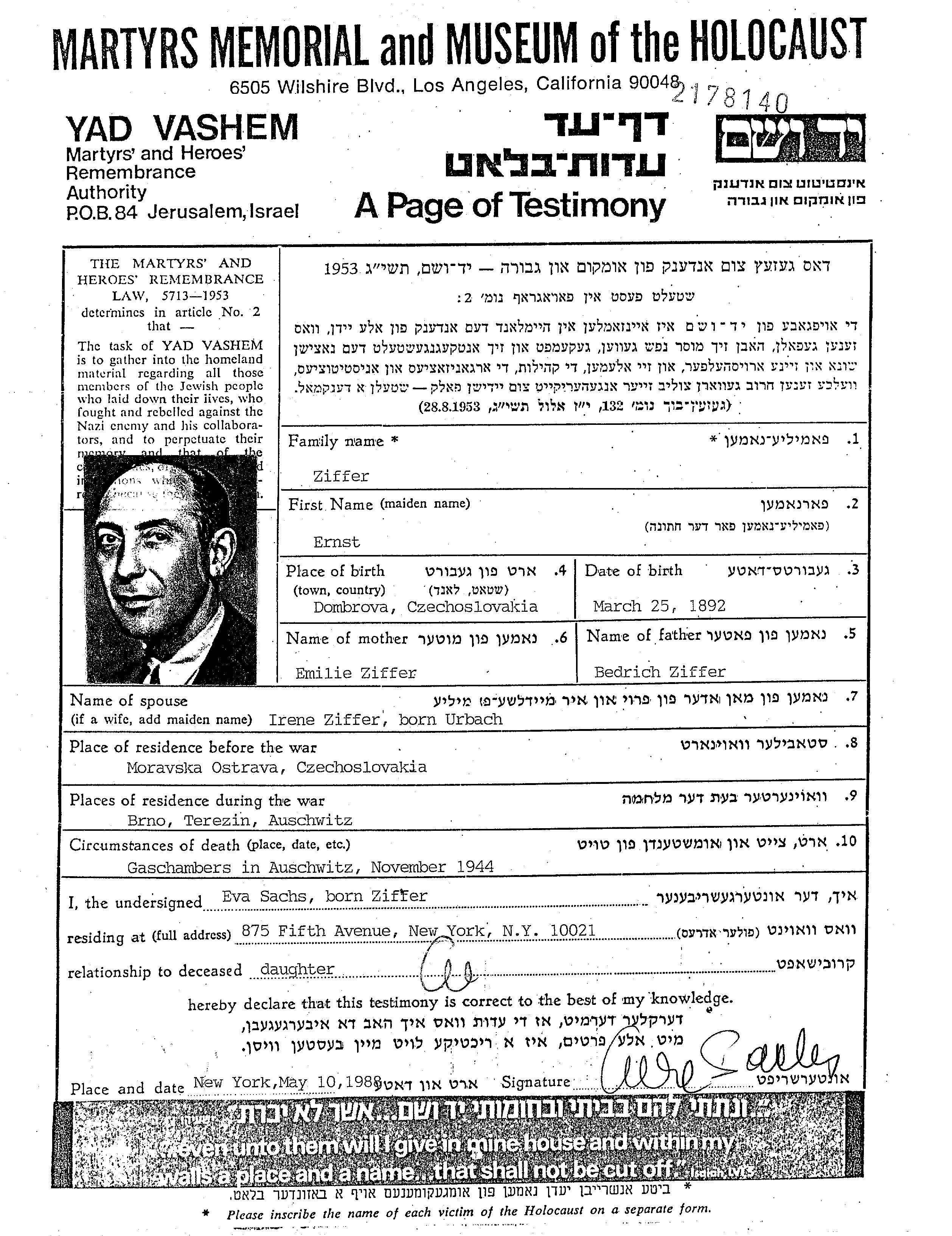 | Ziffer | Ernst | 1892 | Moravska Ostrava, Czechoslovakia | Page of Testimony |