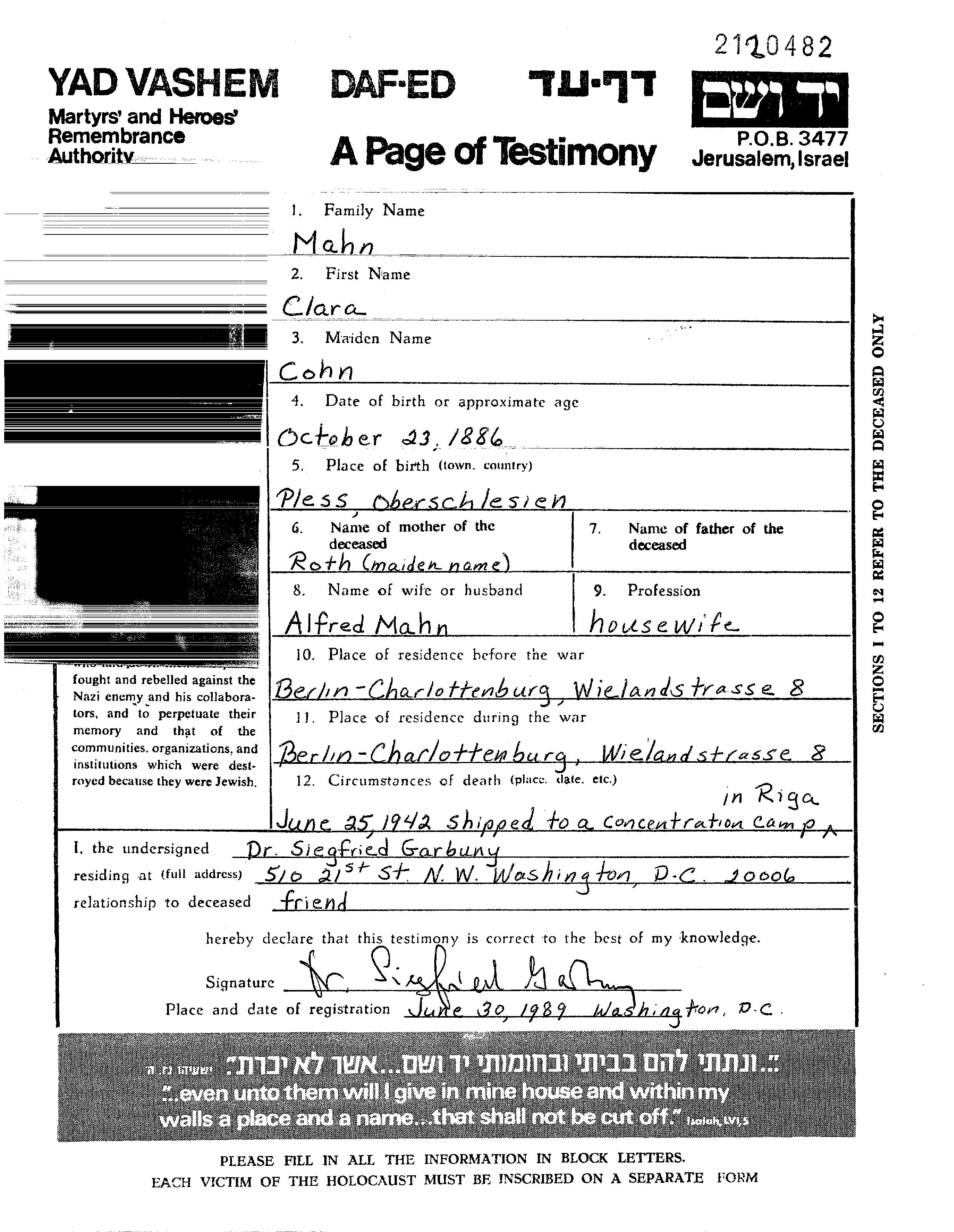 Clara Mahn nee Cohn Kun was born in Pszczyna, Poland, 1886. She was a housewife. Prior to WWII she lived in Berlin, Germany. Clara was murdered in the Shoah. Place of death: Riga, Latvia.