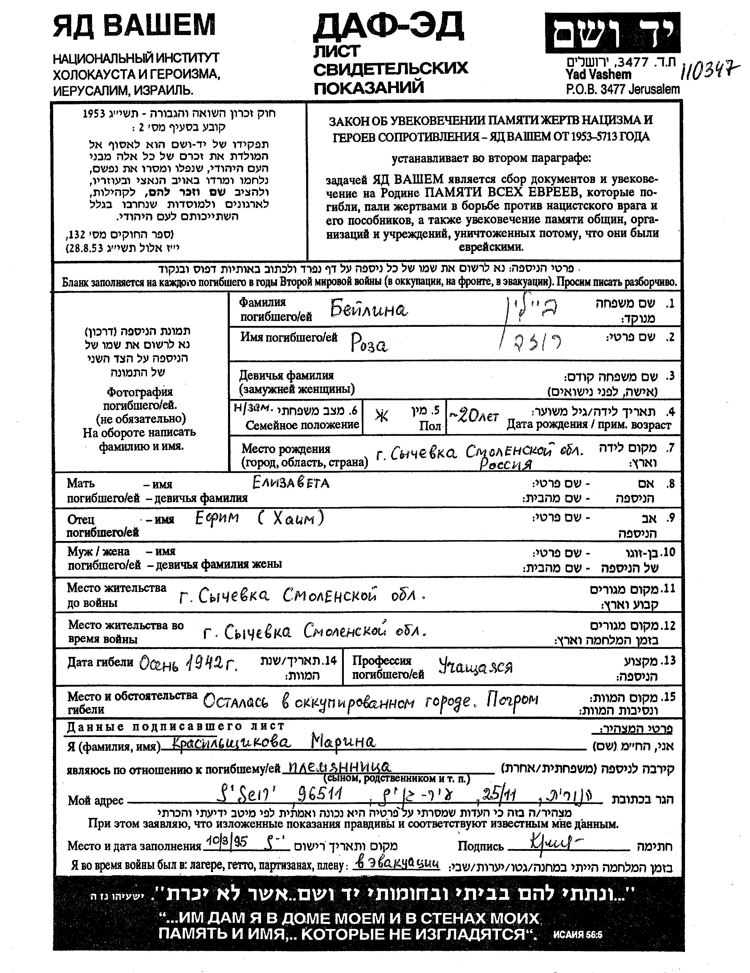 Roza Beylin was born in Sychevka, Russia (USSR), 1922. She was a pupil. Prior to WWII she lived in Sychevka, Russia (USSR). Roza was murdered in the Shoah. Place of death: Sychevka, Russia (USSR), 1942.