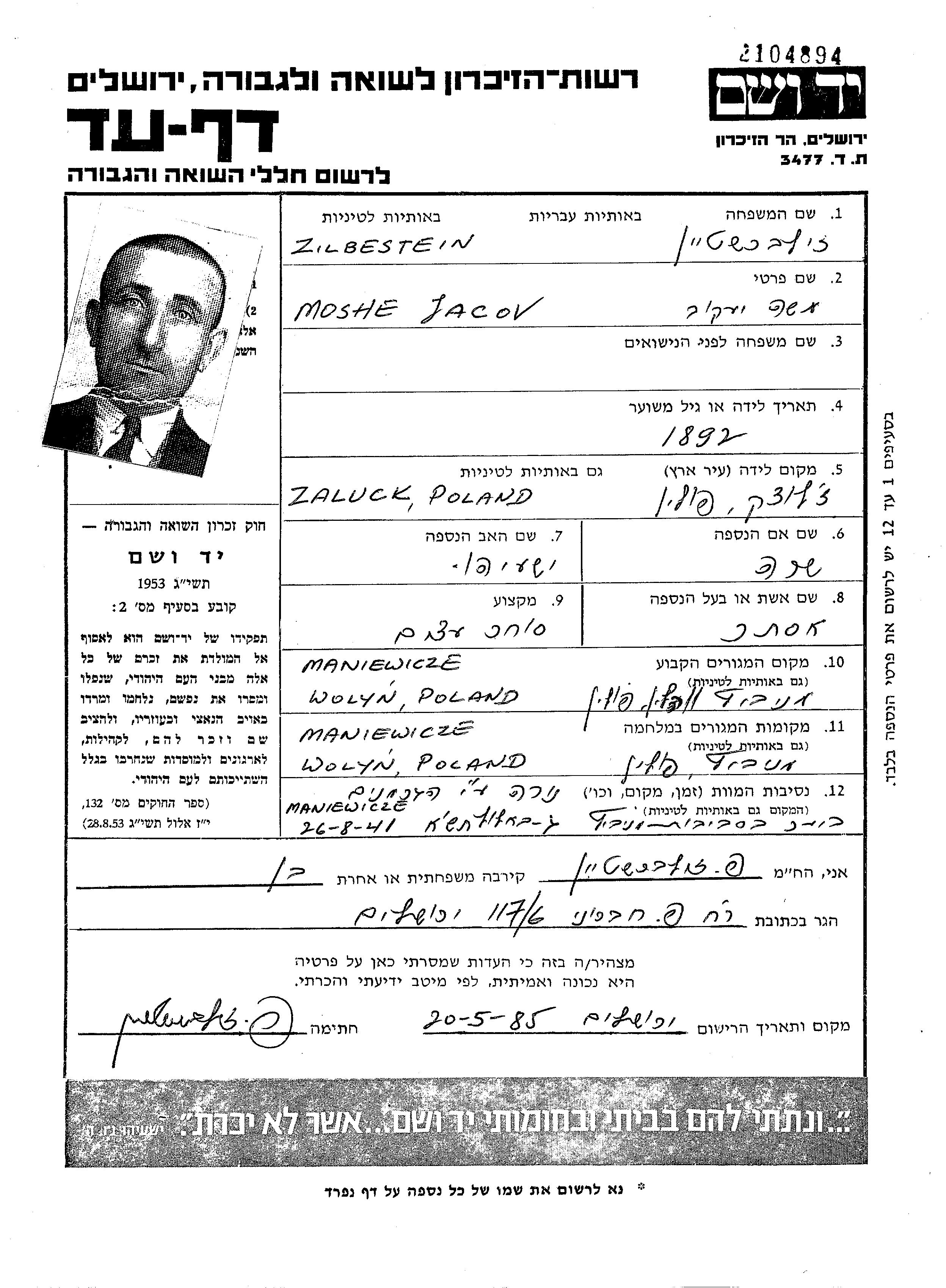 Jacov Moshe Zilberstein was born in Zoludzk, Poland, 1892. He was a wood merchant. Prior to WWII he lived in Maniewicze, Poland. Jacov Moshe was murdered in the Shoah. Place of death: Maniewicze, Poland, 26/08/1941.