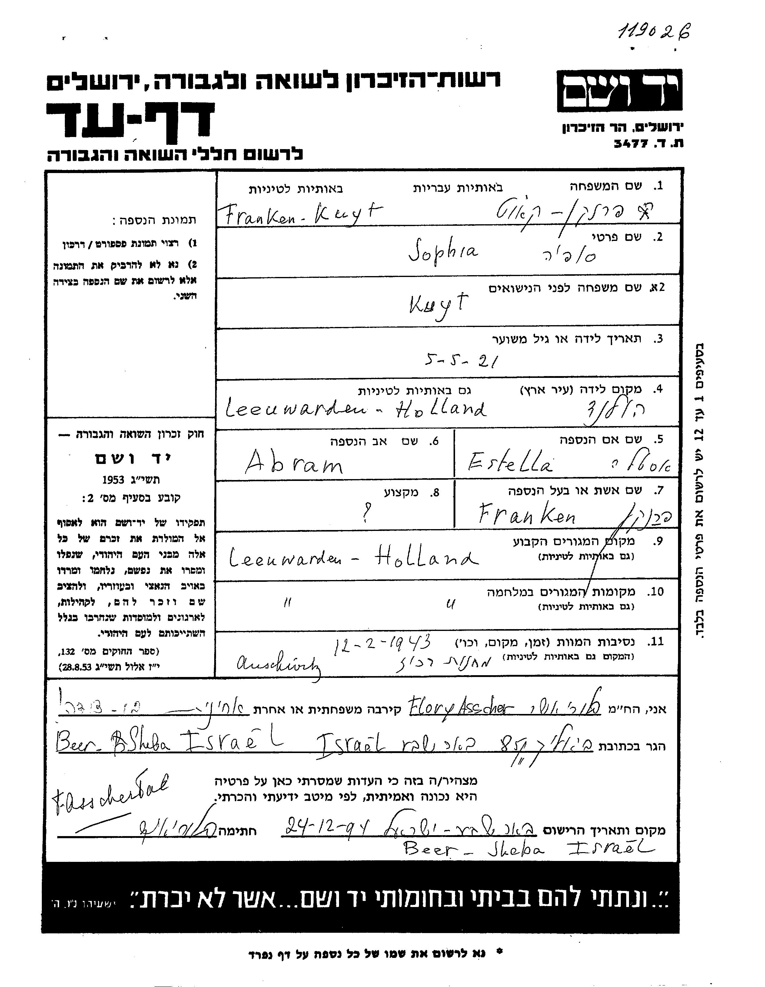 Franken Sophia 1921 Leeuwarden, The Netherlands Page of Testimony