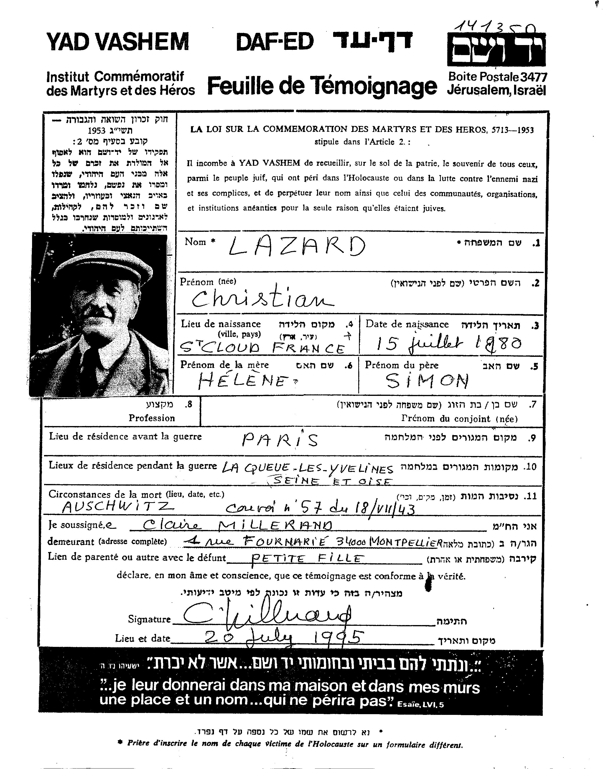 Lazard Christian 1880 Paris, France Page of Testimony