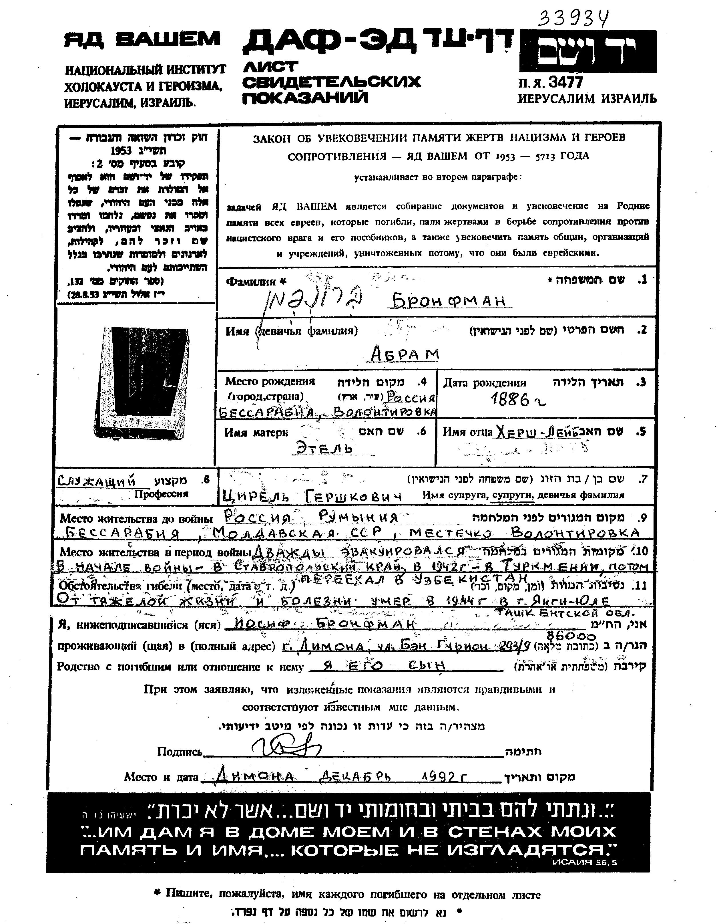 | Bronfman | Abram | 1886 | Volintiri, Romania | Page of Testimony |