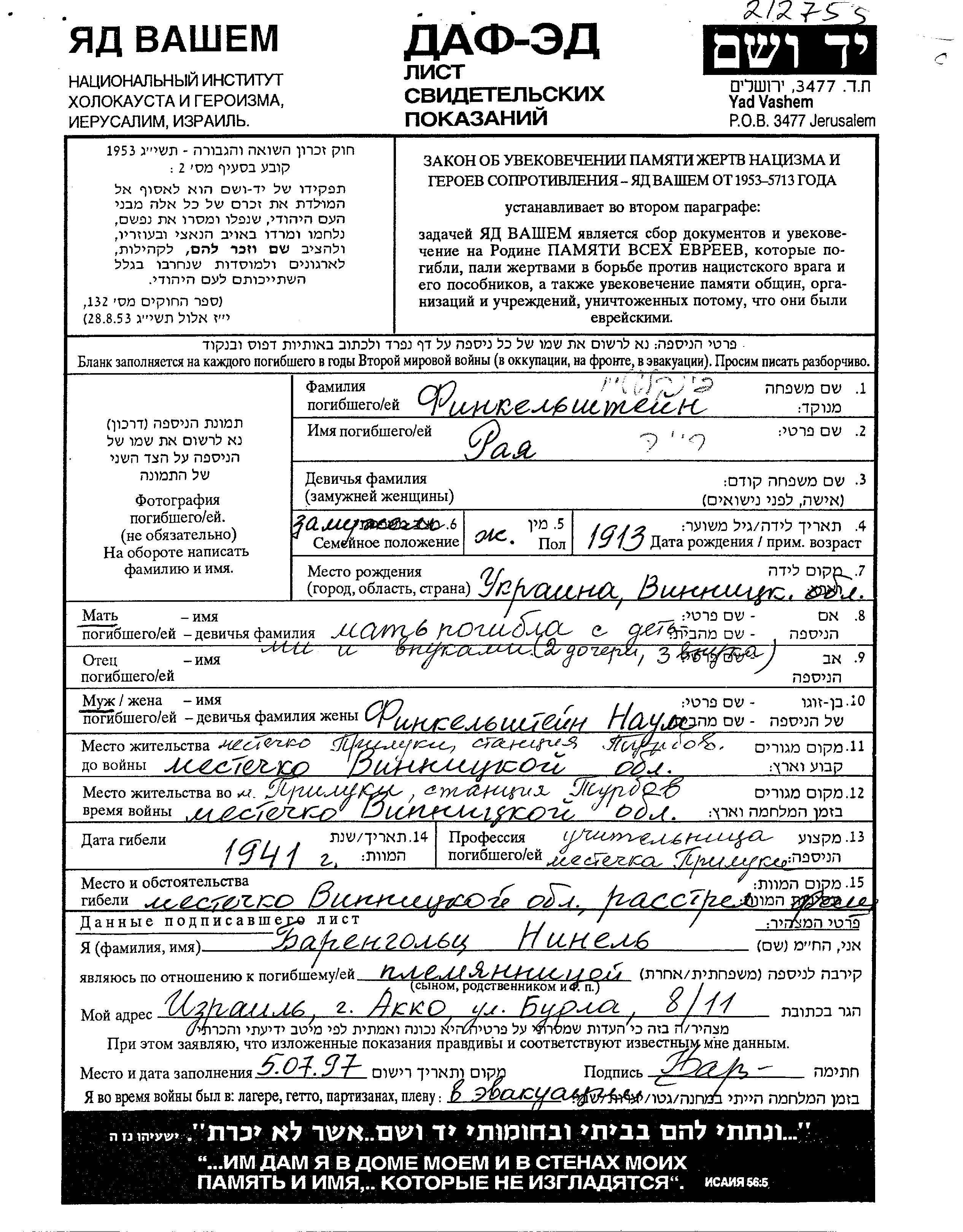 Raia Finkelshtein was born in Vinnitsa, Ukraine (USSR), 1913. She was a teacher. Prior to WWII she lived in Turbov, Ukraine (USSR). Raia was murdered in the Shoah. Place of death: Turbov, Ukraine (USSR), 1941.