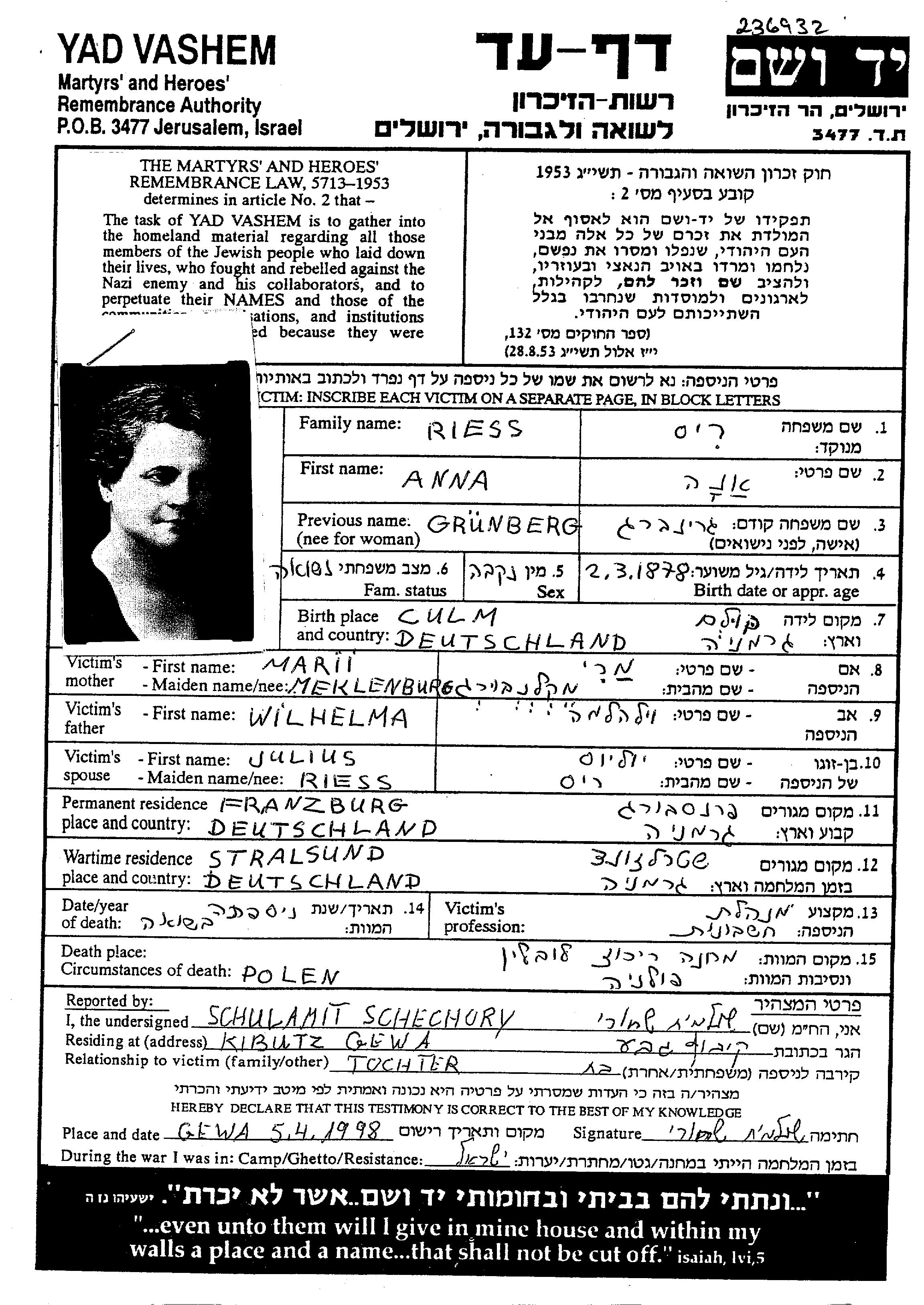 Anna Riess nee Gruenberg was born in Chelmno, Poland, 1878. She was a bookkeeper. Prior to WWII she lived in Franzburg, Germany. Anna was murdered in the Shoah. Place of death: Lublin, Poland.