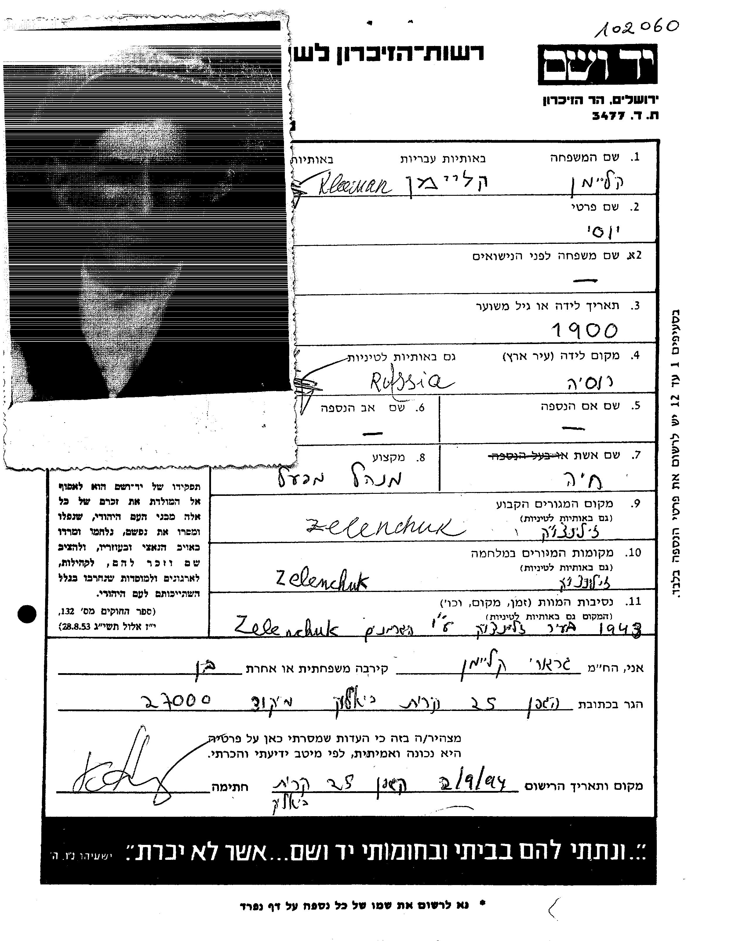 Josi Kleiman was born in Russia (USSR), 1900. He was a factory director. Prior to WWII he lived in Zelenchukskaya, Russia (USSR). Josi was murdered in the Shoah. Place of death: Zelenchukskaya, Russia (USSR), 1943.
