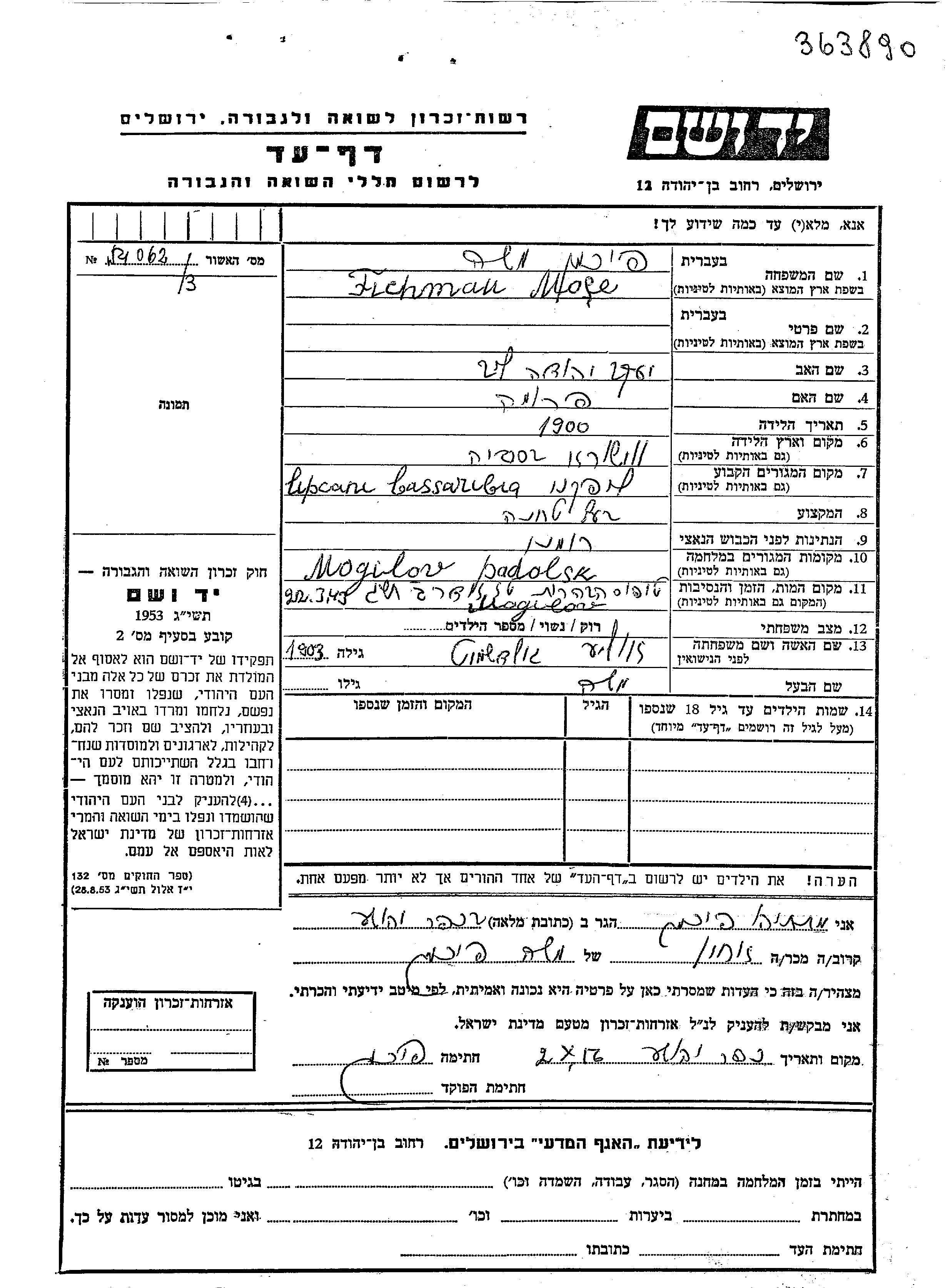 | Fikhman | Moshe | 1900 | Lipcani, Romania | Page of Testimony |