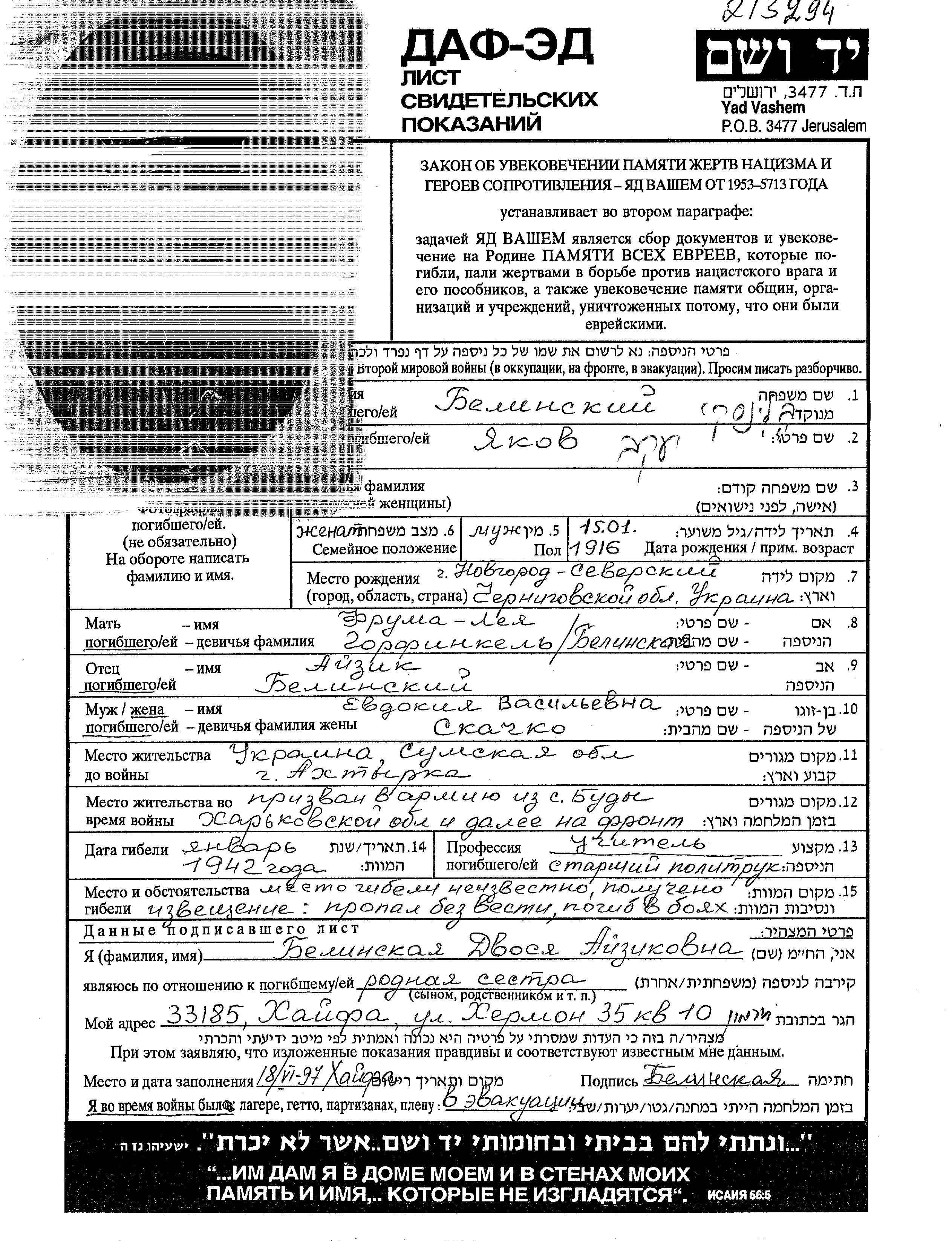 Yakov Belinski was born in Novgorod Severskiy, Ukraine (USSR), 1916. He was a teacher. Prior to WWII he lived in Akhtyrka, Ukraine (USSR). Yakov was murdered in the Shoah. Place of death: unstated place, 1942.