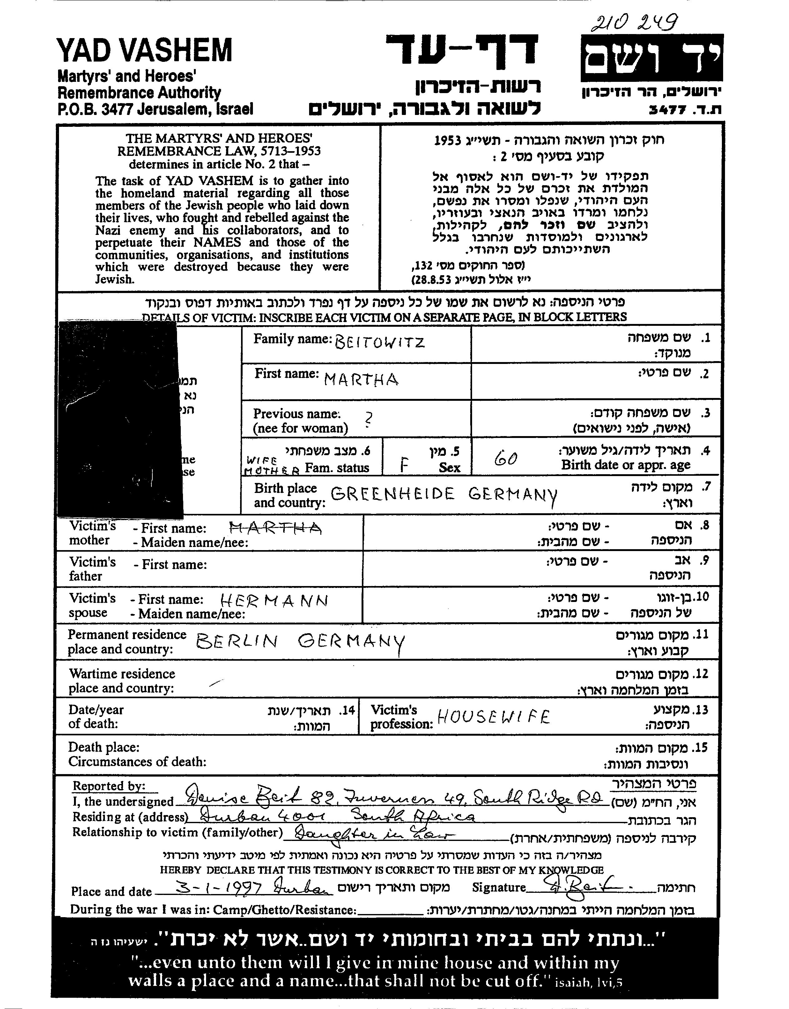 Marta Beitowitz was born in Gruenheide, Germany. She was a housewife. Prior to WWII she lived in Berlin, Germany.