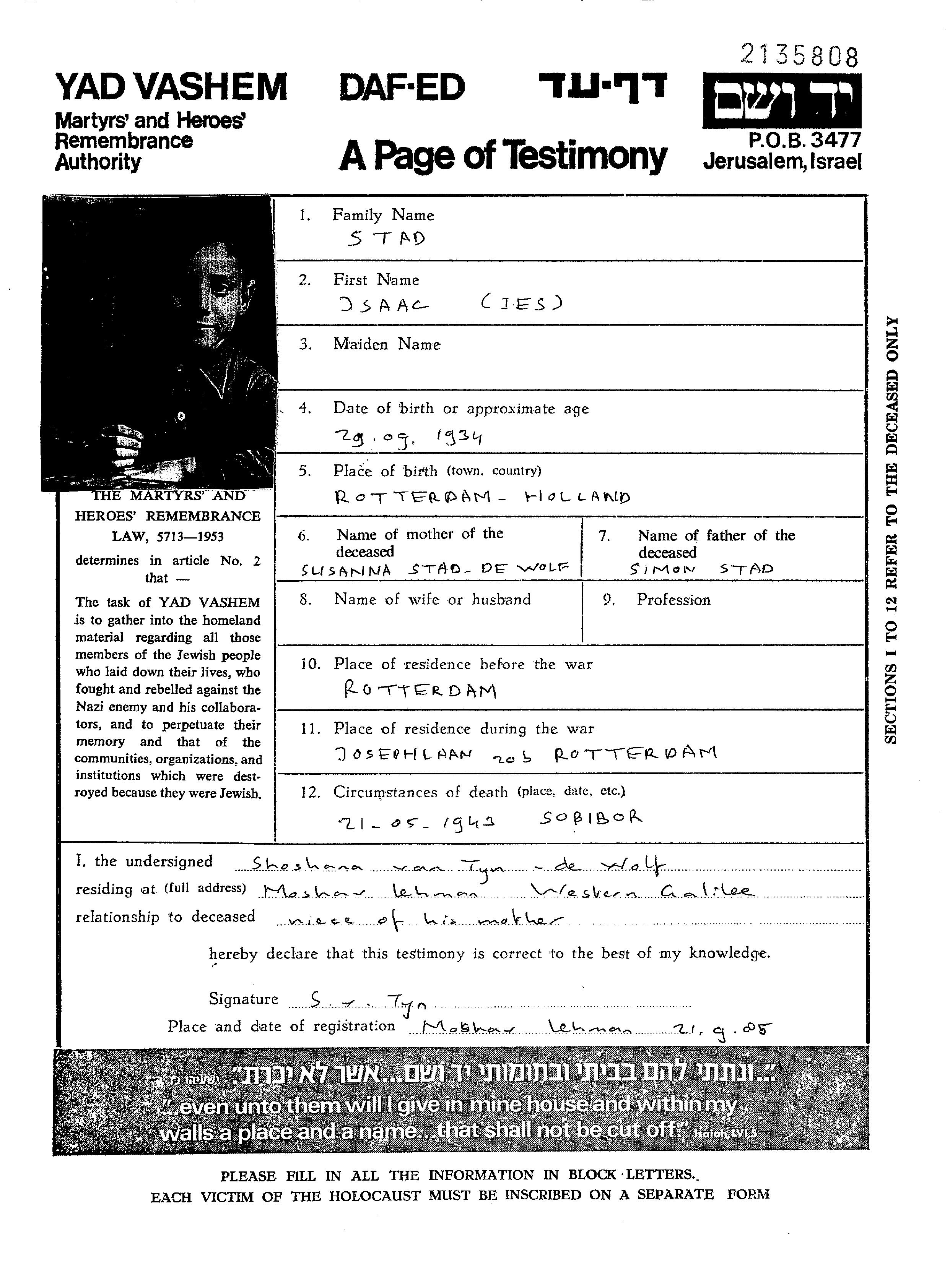 Stad | Isaac | 1934 | Rotterdam, The Netherlands | Page of Testimony |