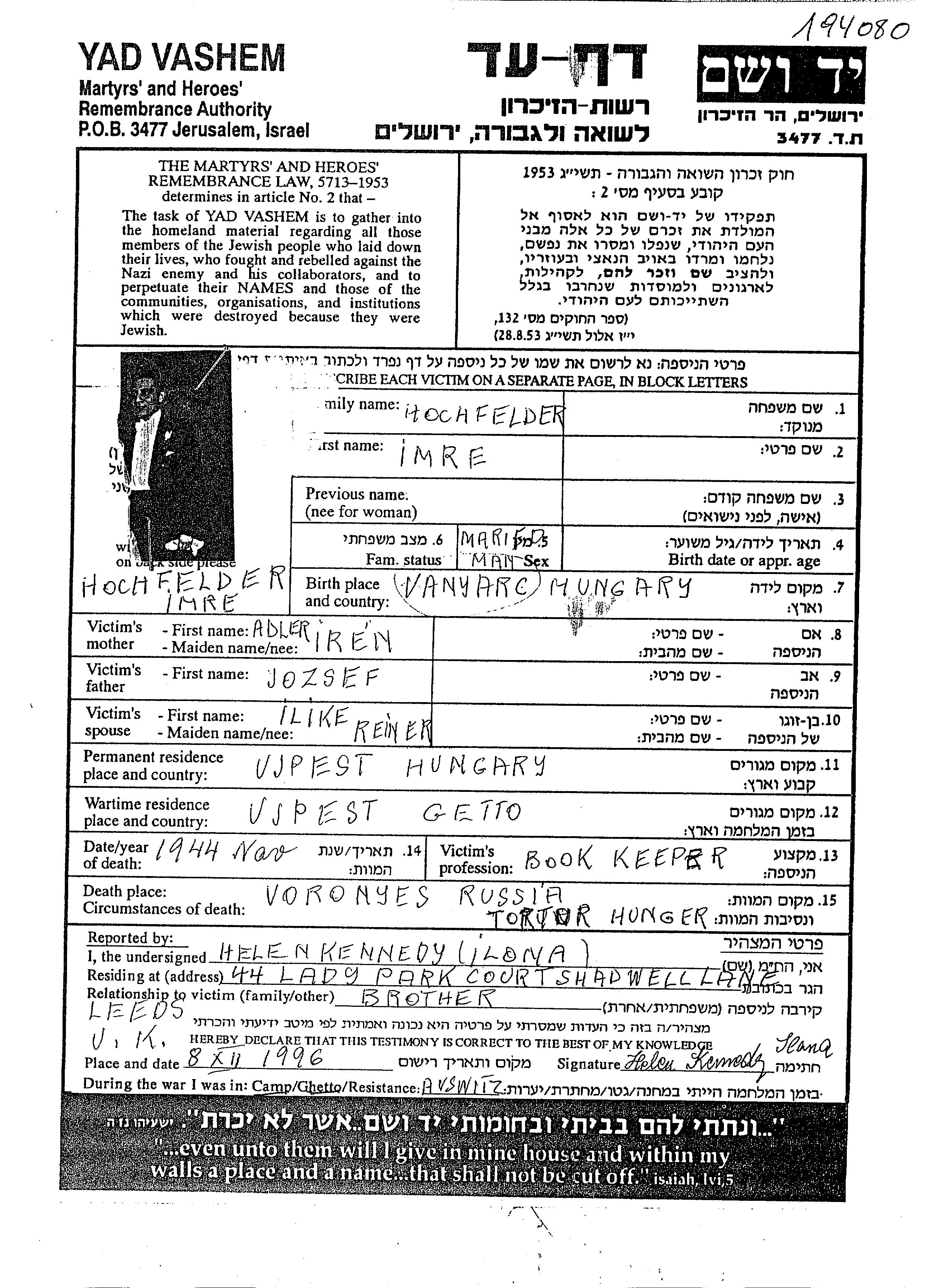 Imre Hochfelder was born in Vanyarc, Hungary. He was a bookkeeper. Prior to WWII he lived in Ujpest, Hungary. Imre was murdered in the Shoah. Place of death: Voronezh, Russia (USSR), 1944.