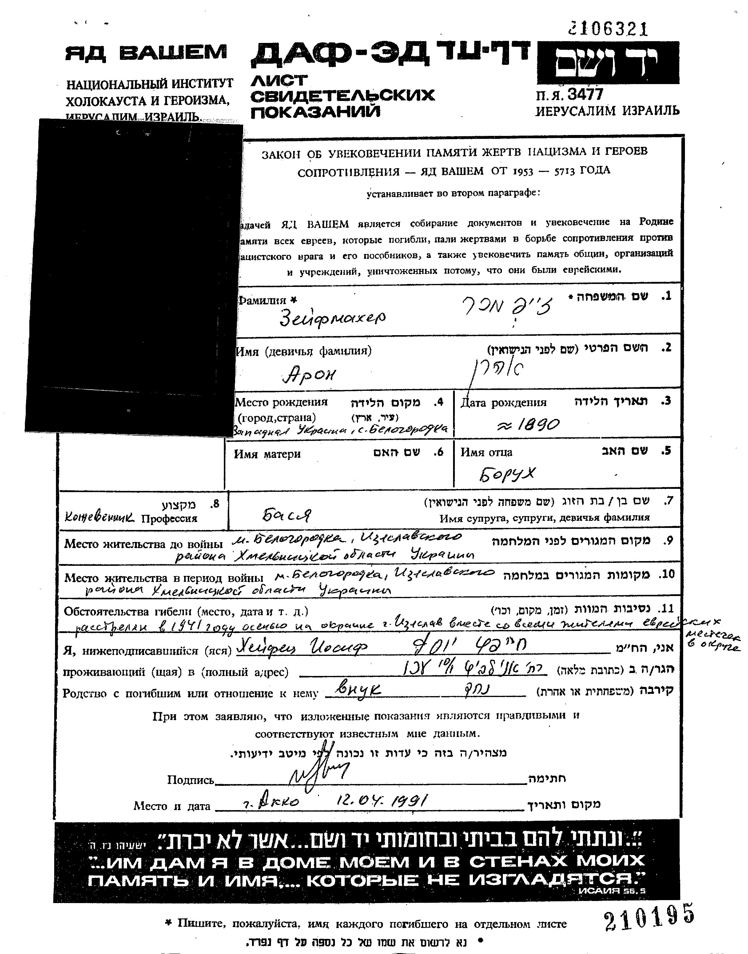 Aron Zeifmakher was born in Belogorodka, Ukraine (USSR), 1890. He was a tanner. Prior to WWII he lived in Belogorodka, Ukraine (USSR). Aron was murdered in the Shoah. Place of death: Izyaslav, Ukraine (USSR), 1941.