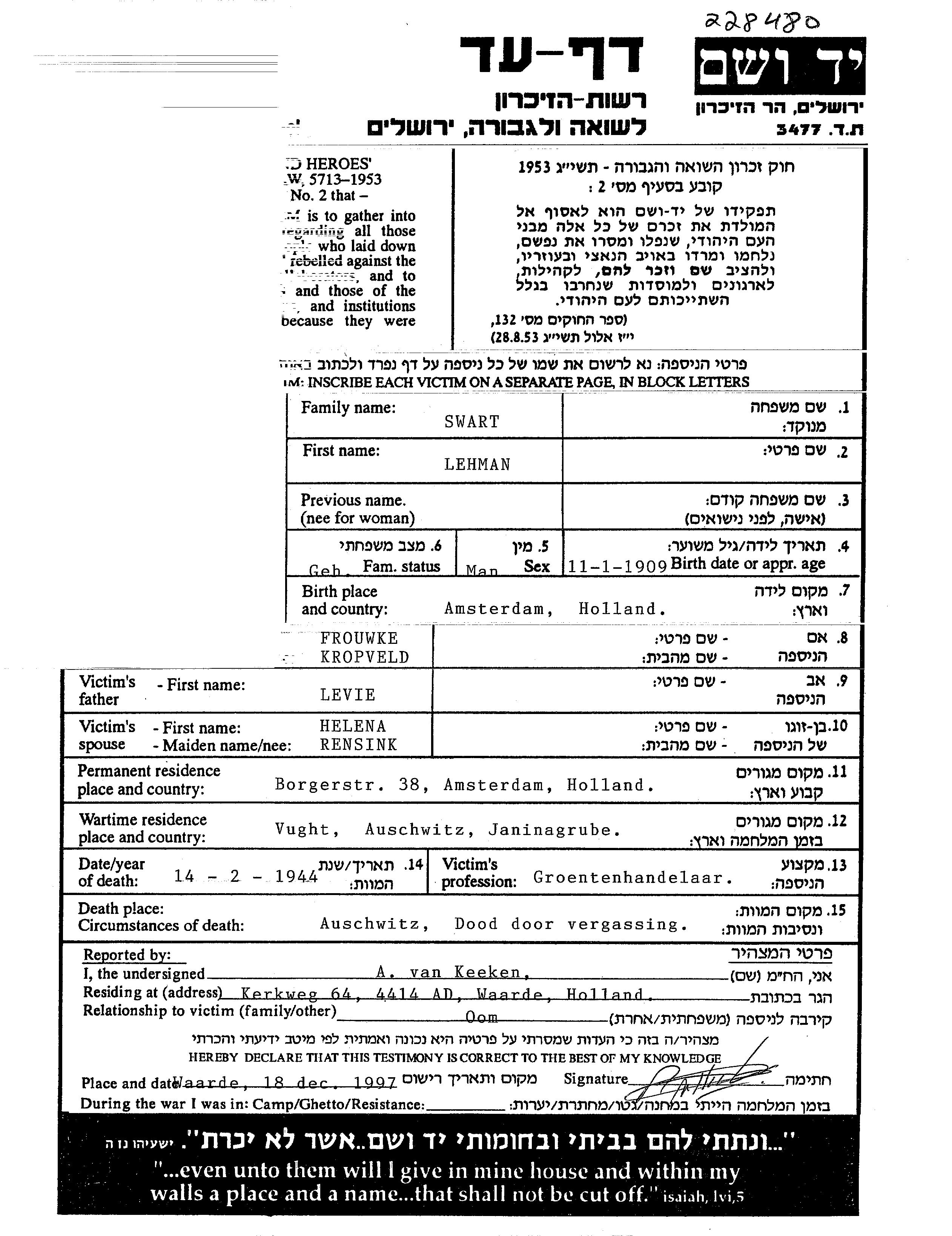 | Swart | Lehman | 1909 | Amsterdam, The Netherlands | Page of Testimony |