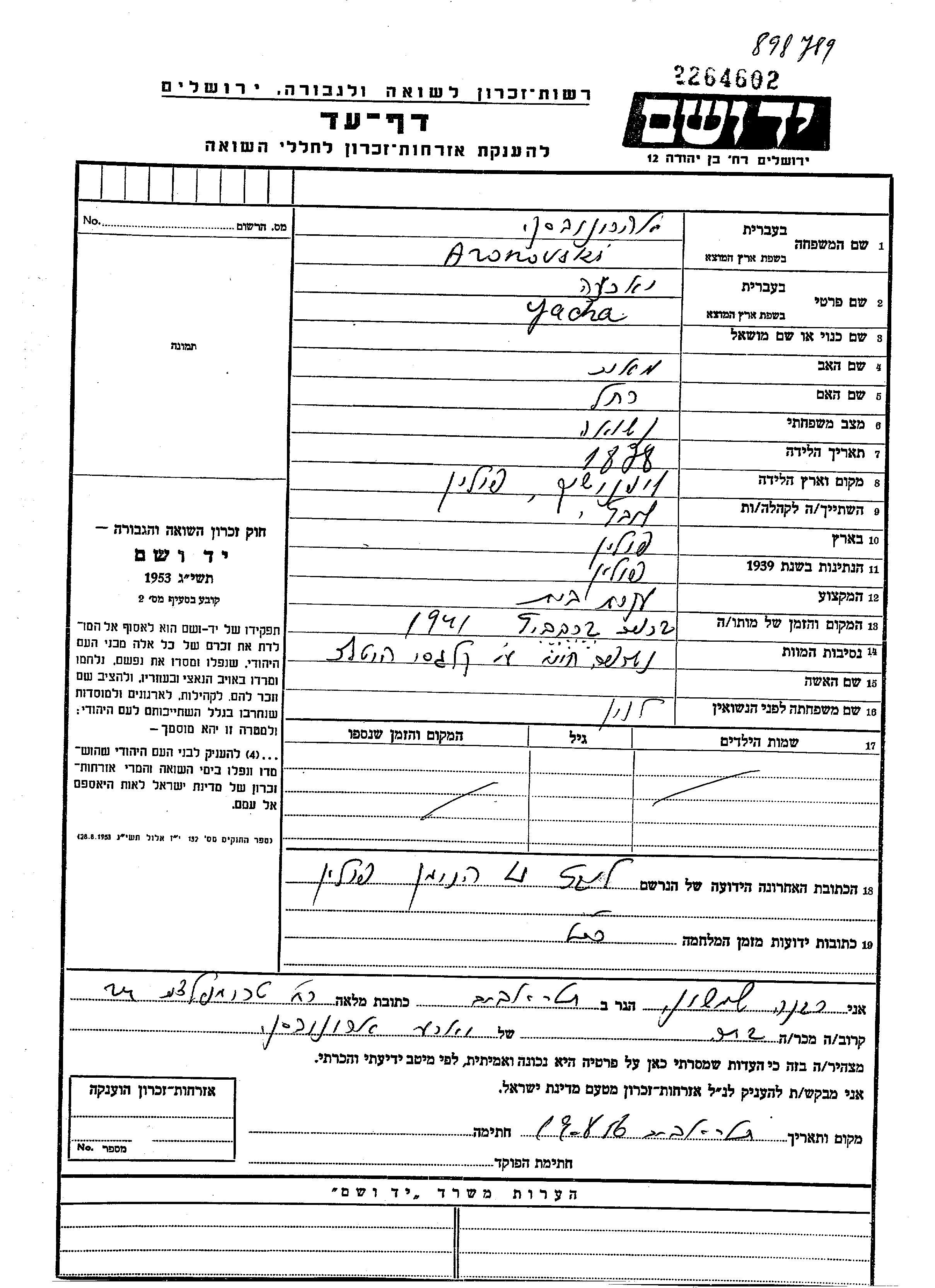 Yakhna Aronovski nee Levin was born in Lipniszki, Poland, 1878. She was a housewife. Prior to WWII she lived in Lubcza na Niemnem, Poland. Yakhna was murdered in the Shoah. Place of death: unstated place, 1941.