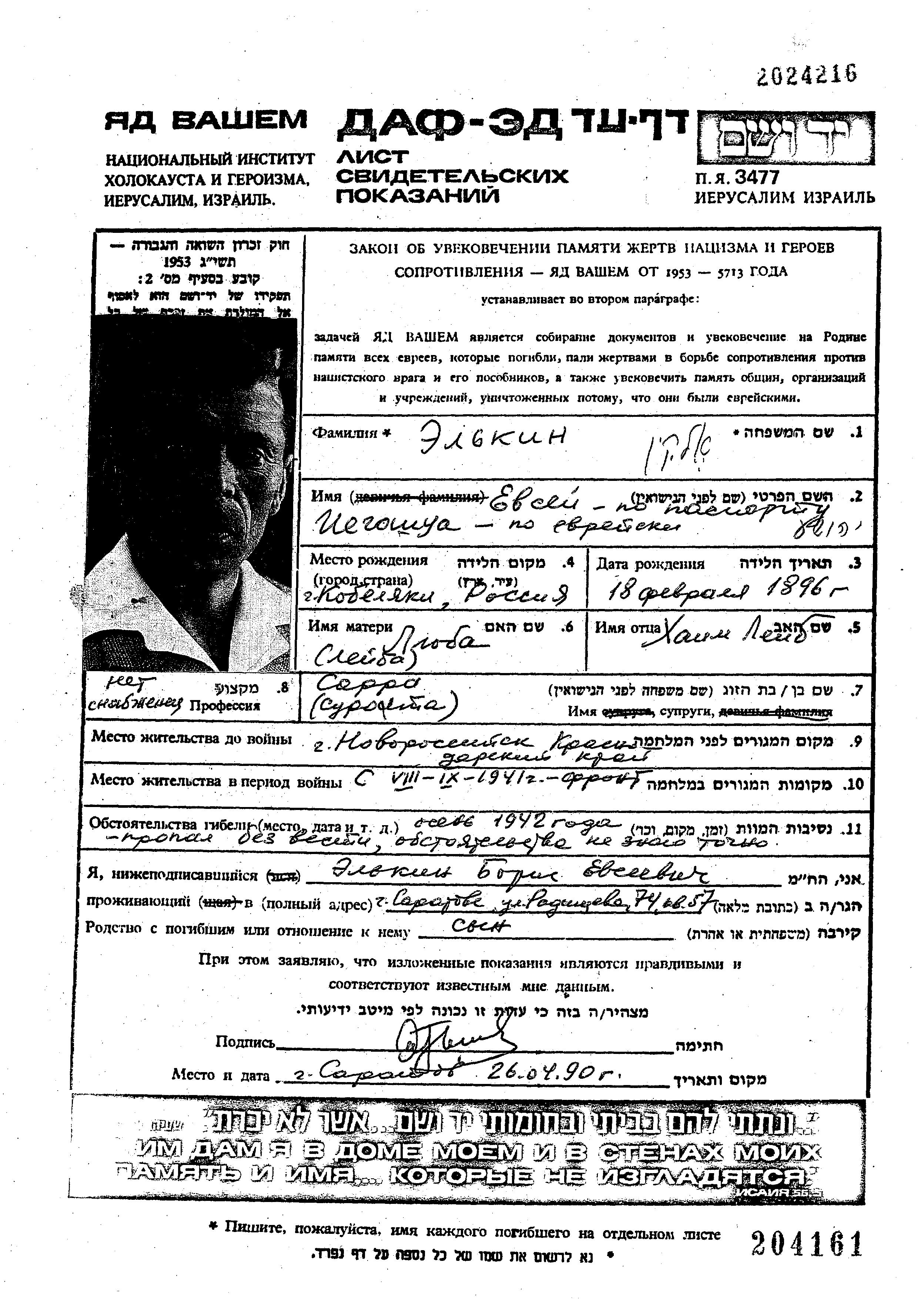 Evsei Elkin was born in Kobelyaki, Ukraine (USSR), 1896. He was a supplier. Prior to WWII he lived in Novorossiysk, Russia (USSR). Evsei was murdered in the Shoah. Place of death: unstated place, 1942.