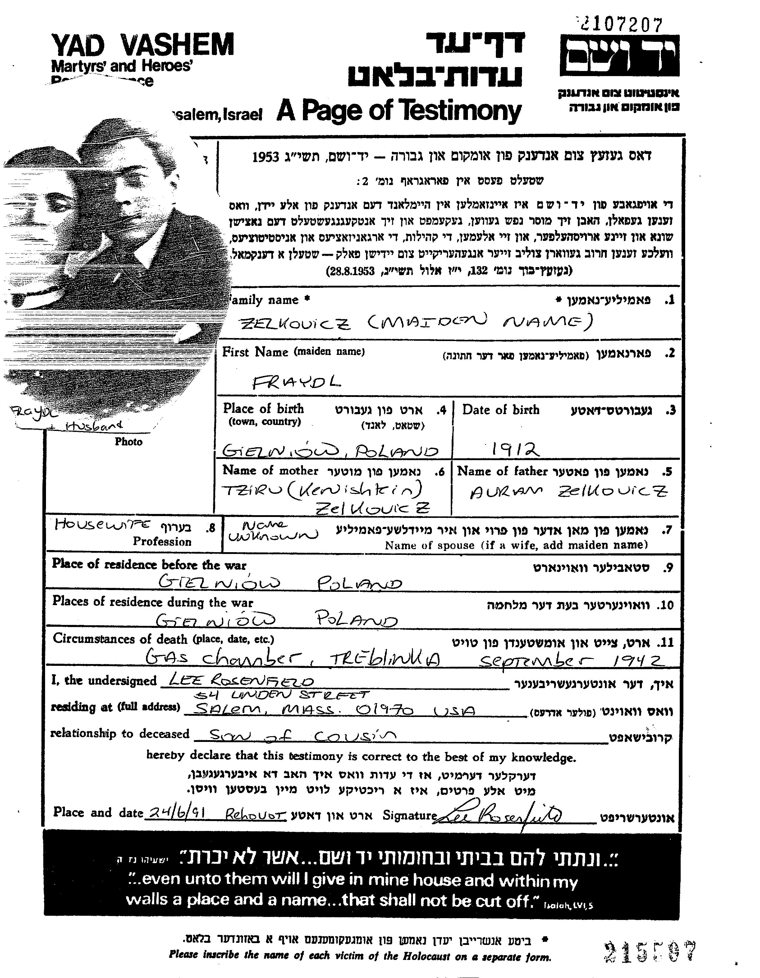 Fraydl Surname unknown nee Zelkovicz was born in Gielniow, Poland, 1912. She was a housewife. Prior to WWII she lived in Gielniow, Poland. Fraydl was murdered in the Shoah. Place of death: Treblinka, Poland, 1942.