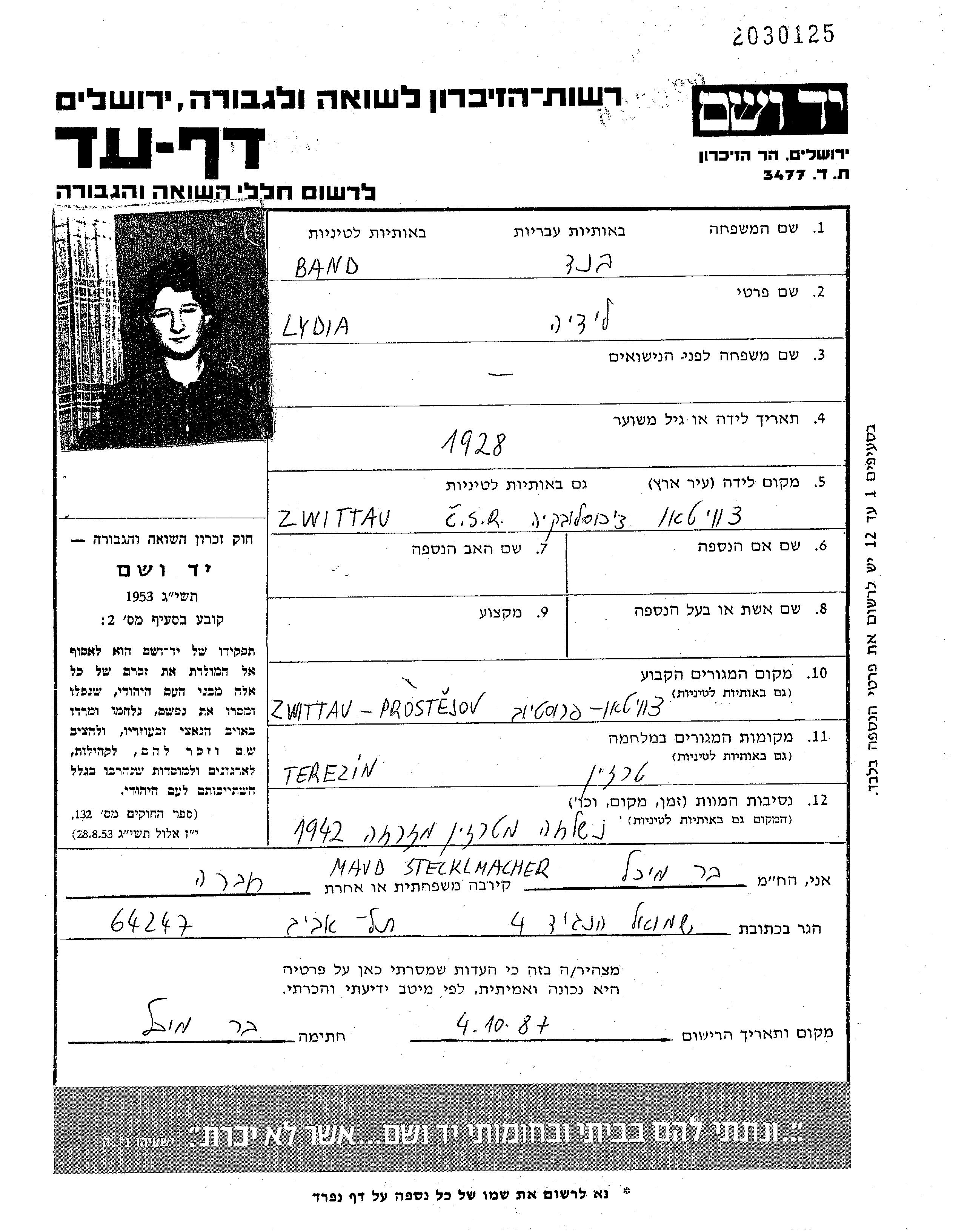 Band Lydia 1928 Svitavy, Czechoslovakia Page of Testimony