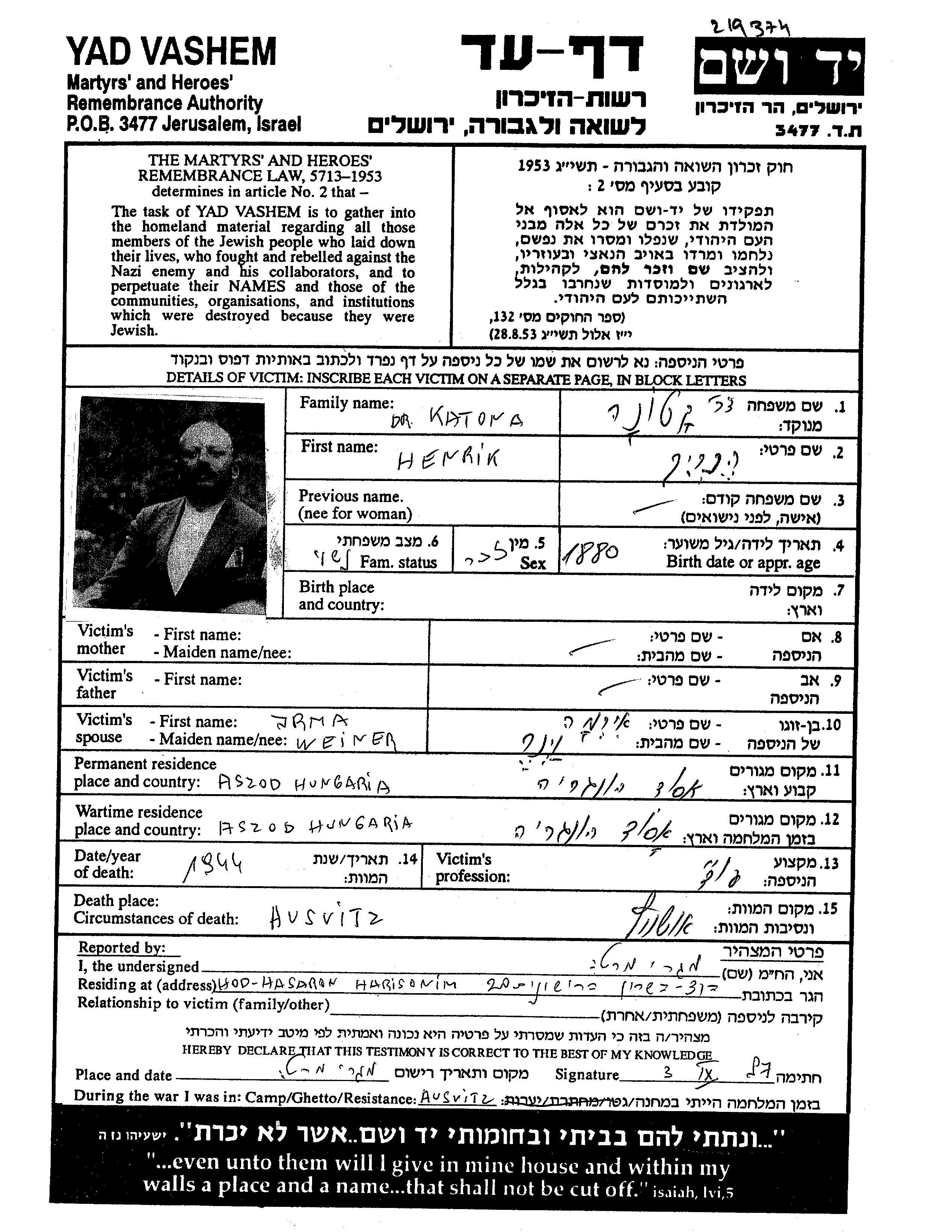 Henrikh Katona was born, 1880. He was a lawyer. Prior to WWII he lived in Aszod, Hungary.