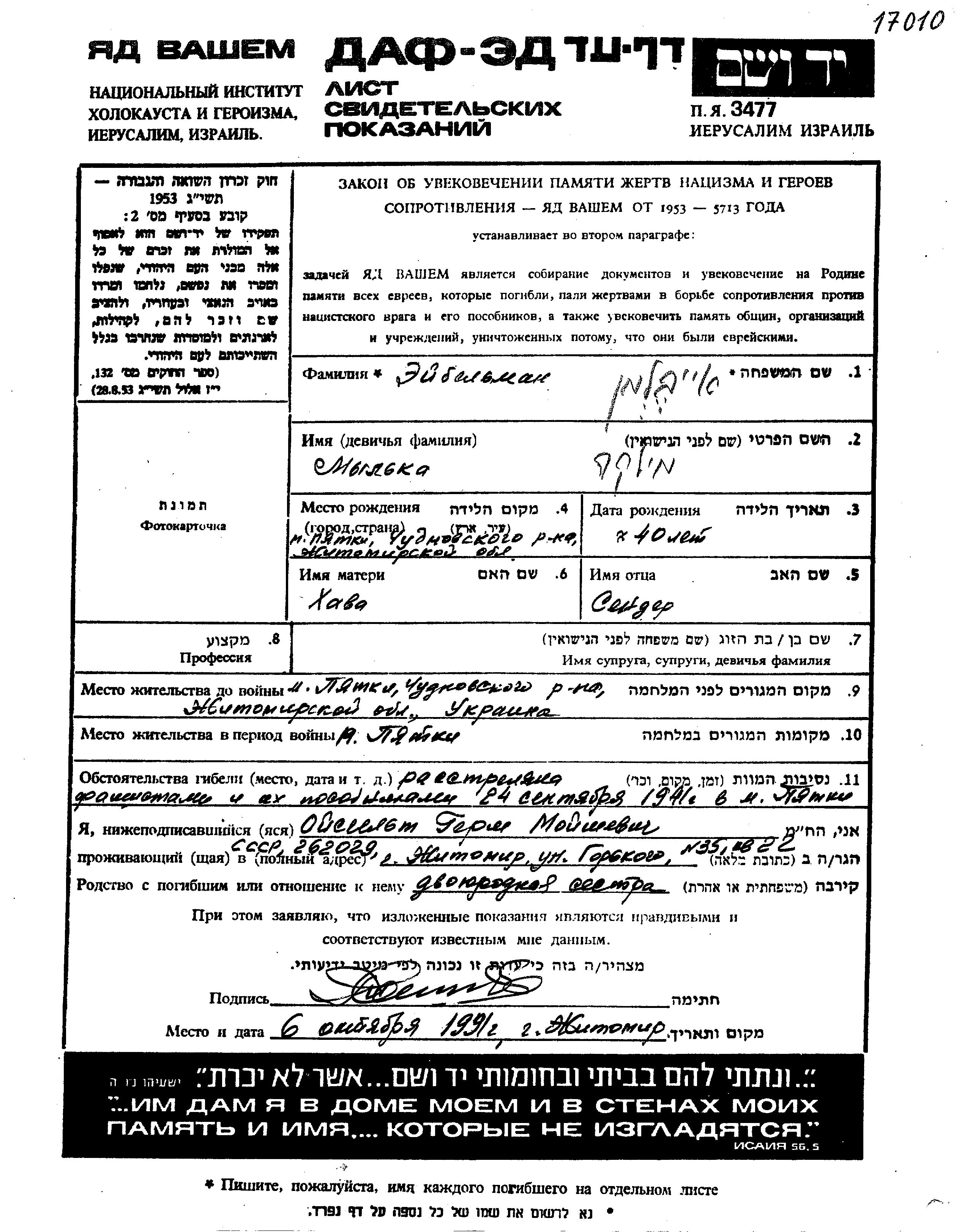 Mylka Eibelman was born in Pyatka, Ukraine (USSR), 1901 to Sender and Khava. Prior to WWII she lived in Pyatka, Ukraine (USSR). During the war she was in Pyatka, Ukraine (USSR). Mylka was murdered in the Shoah. Place of death: Pyatka, Ukraine (USSR), 24/09/1941.