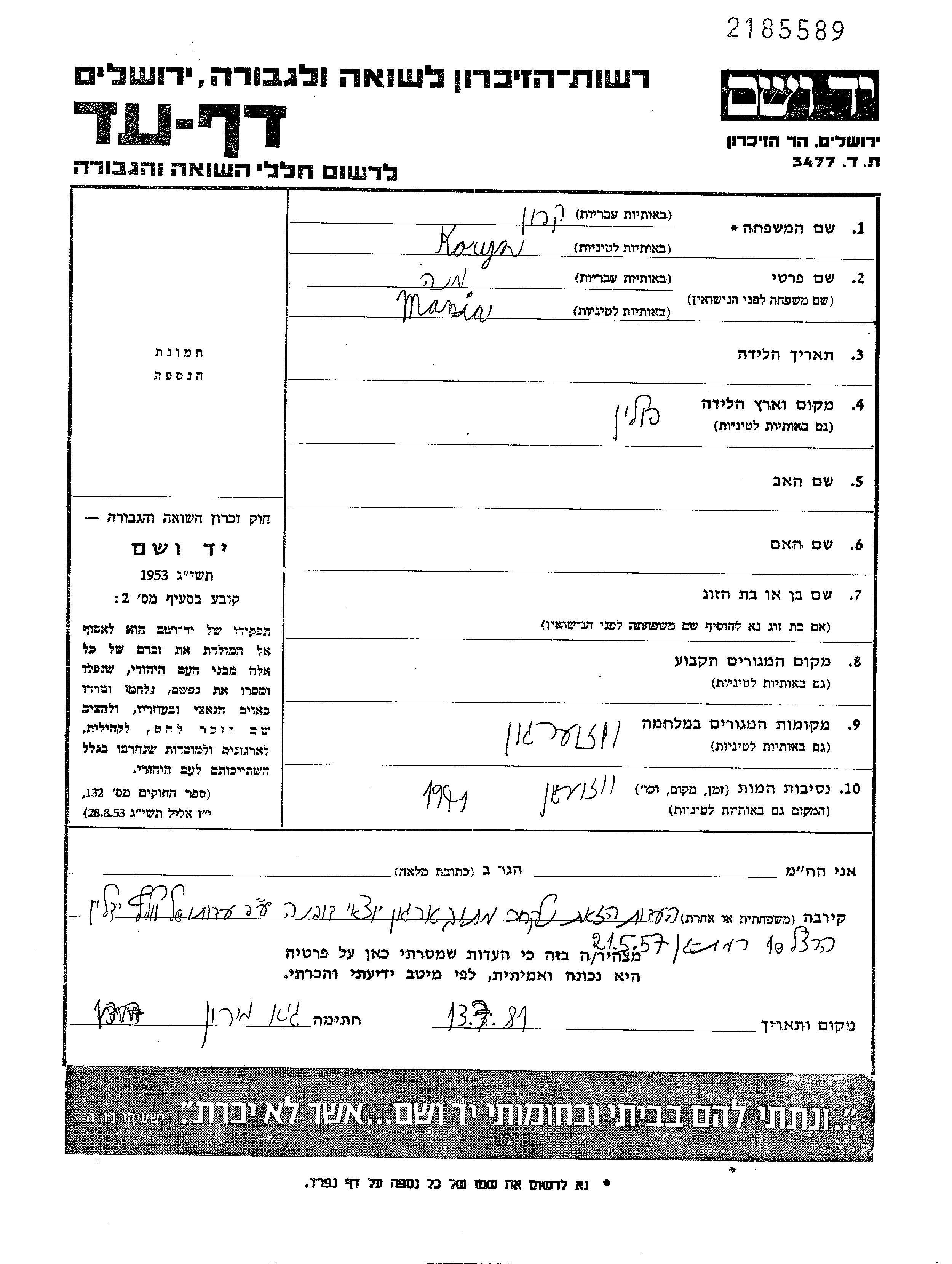 Mania Koryn was born in Poland. Prior to WWII she lived in Jezierzany, Poland. During the war she was in Jezierzany, Poland. Mania was murdered in the Shoah. Place of death: Jezierzany, Poland, 1941.
