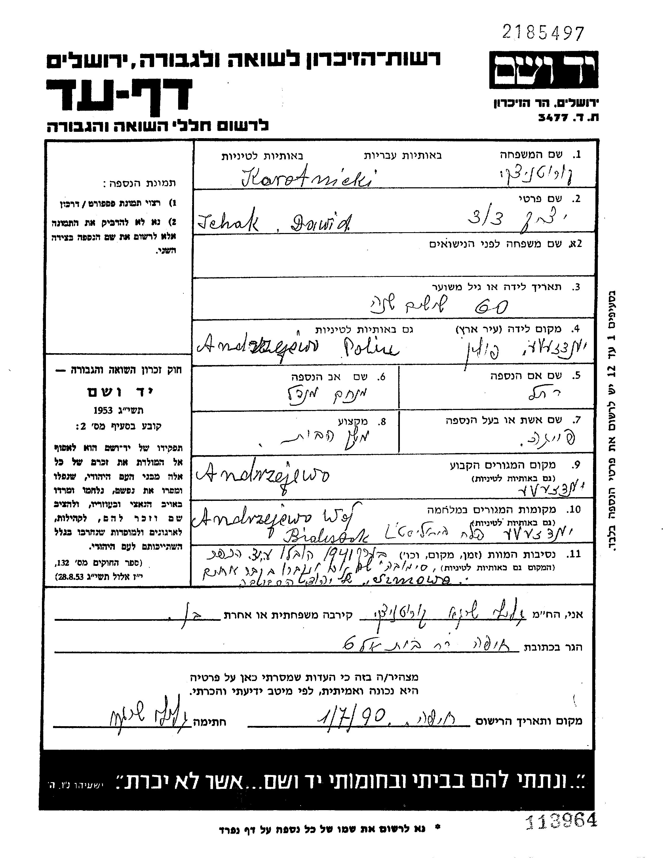 Ichak Dawid Korotnicki was born in Andrzejewo, Poland to Menakhem Mendel and Rakhel. He was a land owner and married to Feiga. Prior to WWII he lived in Andrzejewo, Poland. During the war he was in Andrzejewo, Poland. Ichak Dawid was murdered in the Shoah. Place of death: Szumowo, Poland, 1941.
