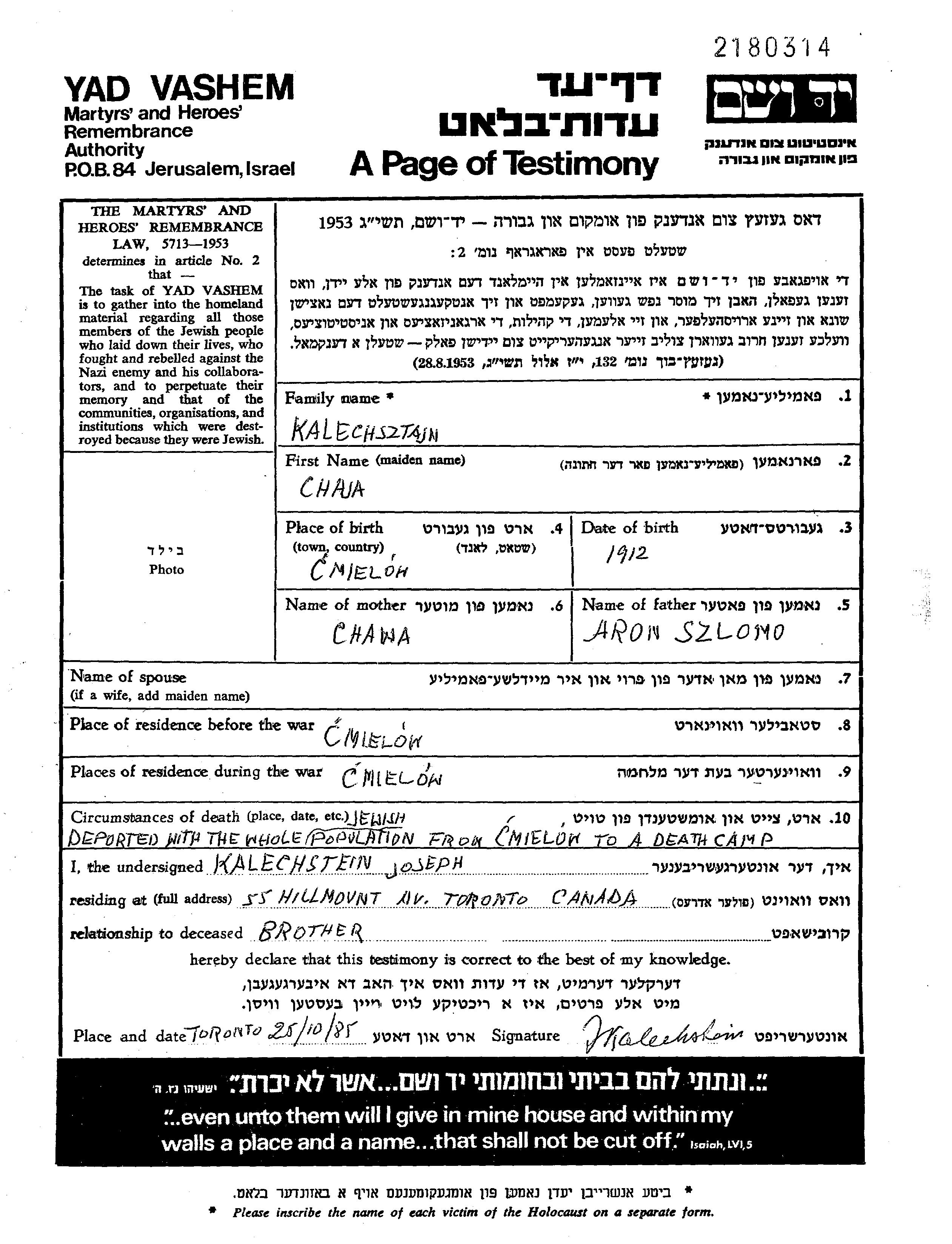 Kalechsztajn Chaja 1912 Cmielow, Poland Page of Testimony