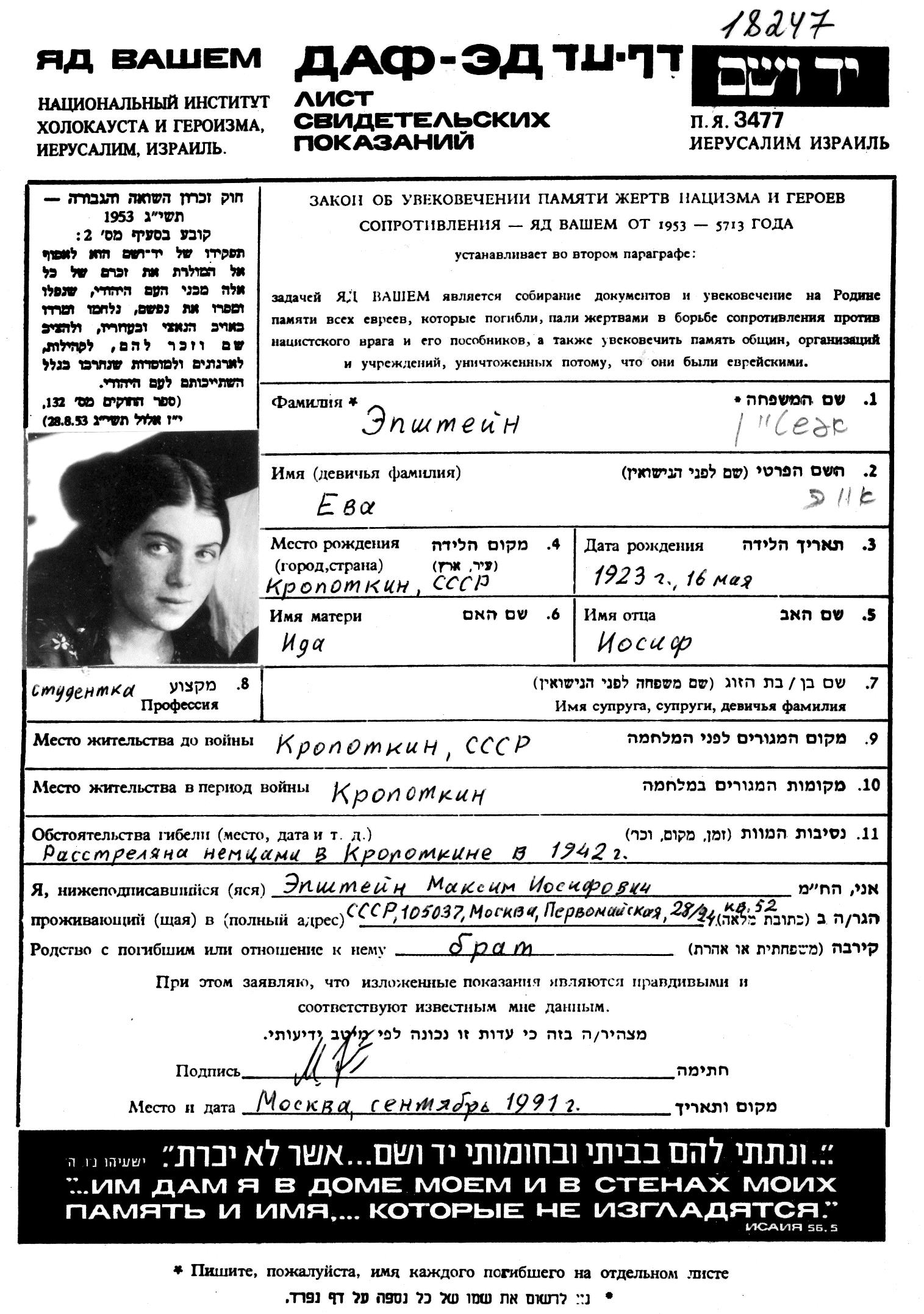 Epshtein | Yeva | 1923 | Kropotkin, Russia (USSR) | Page of Testimony |