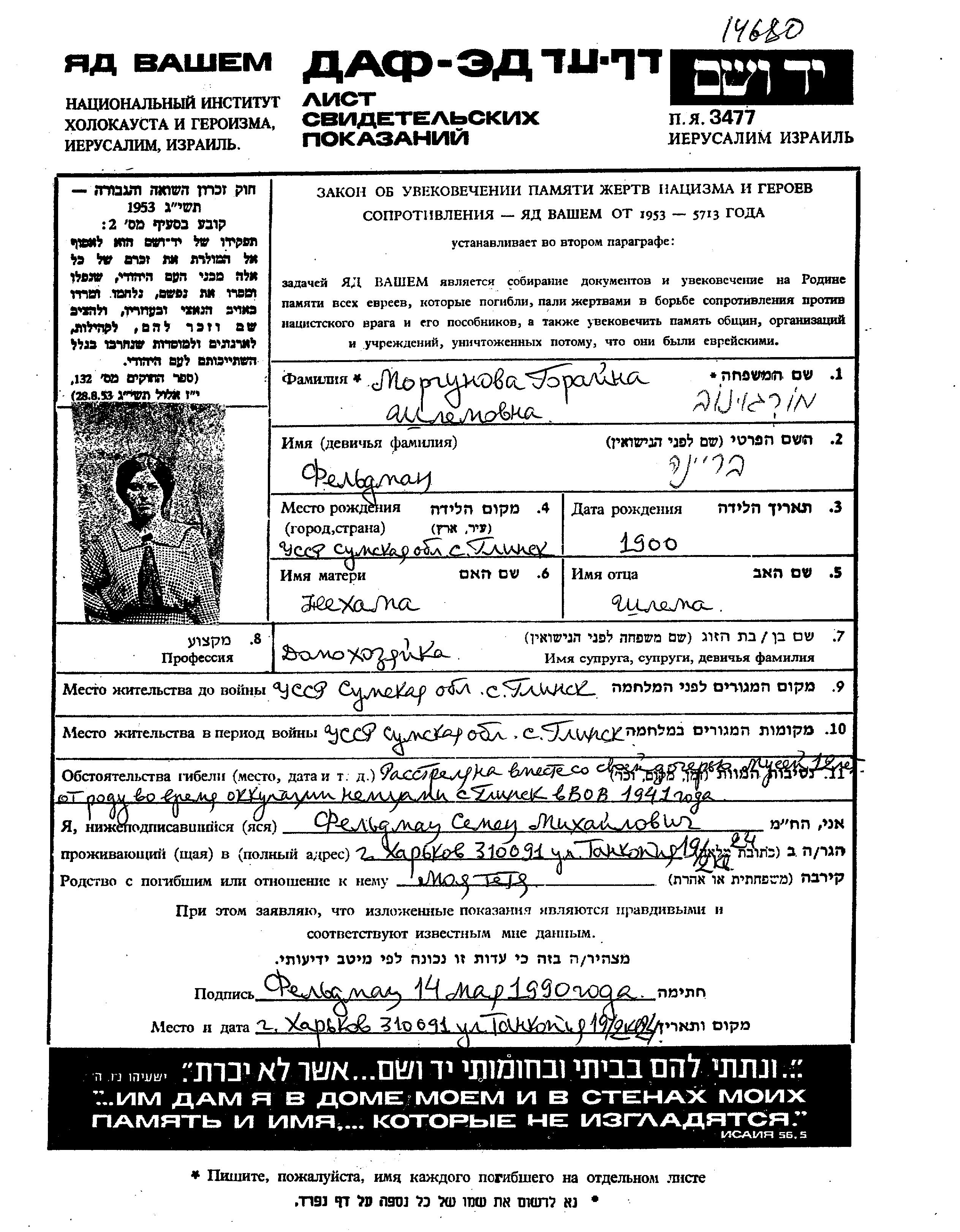 Braina Morgunov nee Feldman was born in Glinsk, Ukraine (USSR), 1900. She was a housewife. Prior to WWII she lived in Glinsk, Ukraine (USSR). Braina was murdered in the Shoah. Place of death: Glinsk, Ukraine (USSR), 1941.