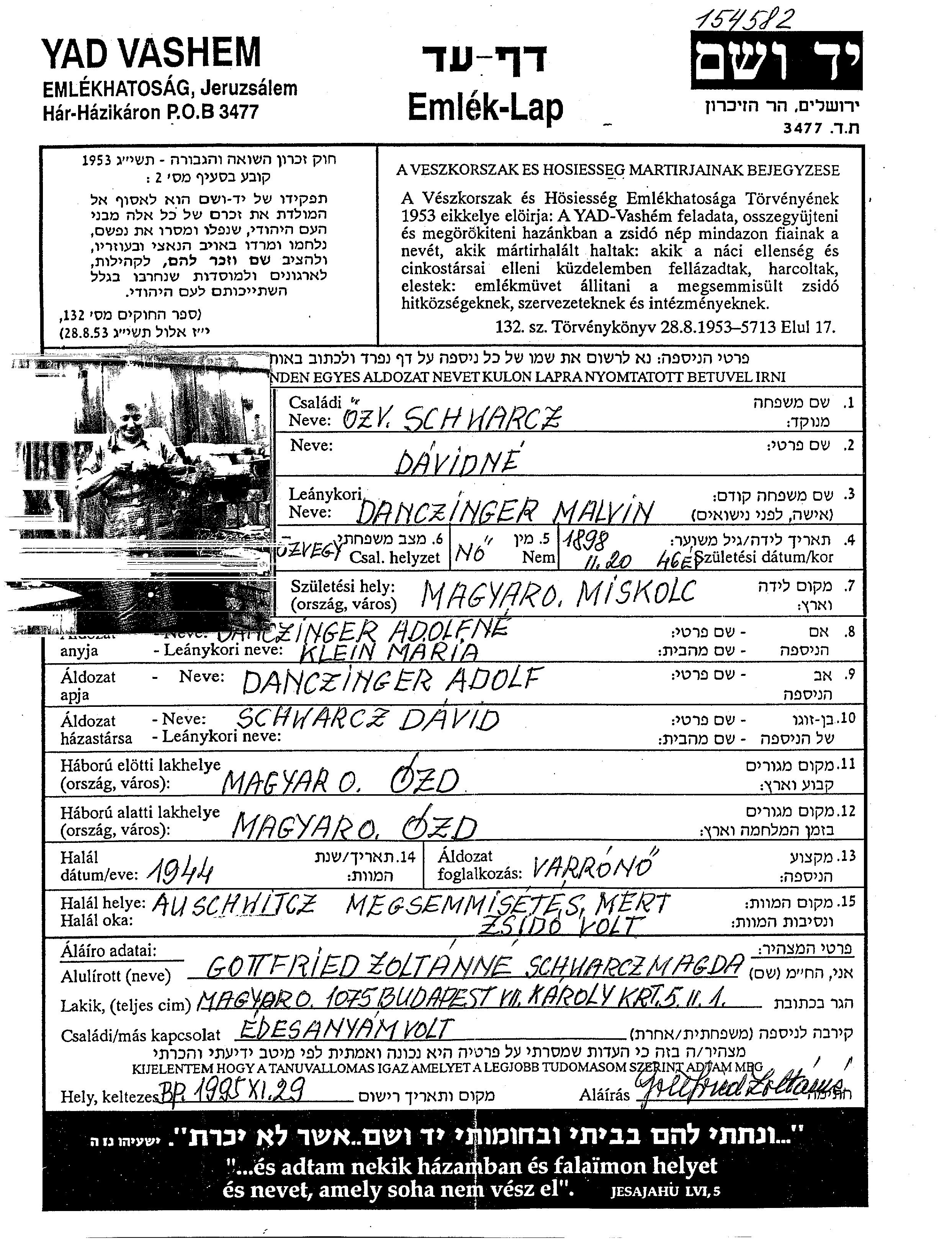 Schwarcz Malvin 1898 Ozd, Hungary Page of Testimony