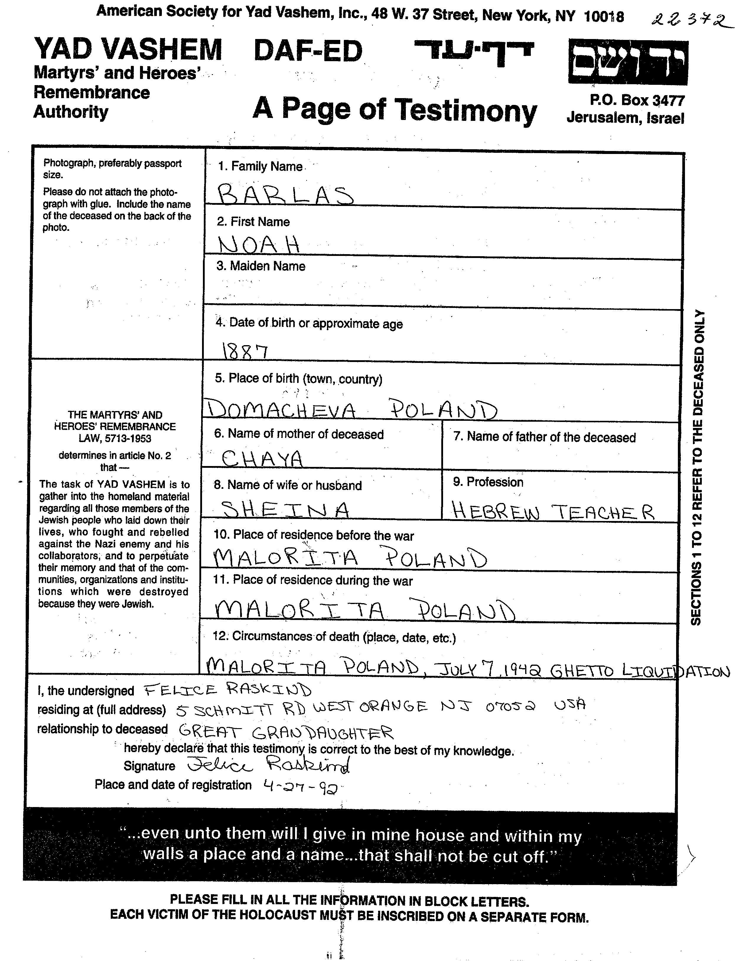 Noakh Barlas was born in Domaczewo, Poland, 1887 to Chaya. He was a teacher and married to Sheina. Prior to WWII he lived in Maloryta, Poland. During the war he was in Maloryta, Poland. Noakh was murdered in the Shoah. Place of death: Maloryta, Poland, 07/07/1942.