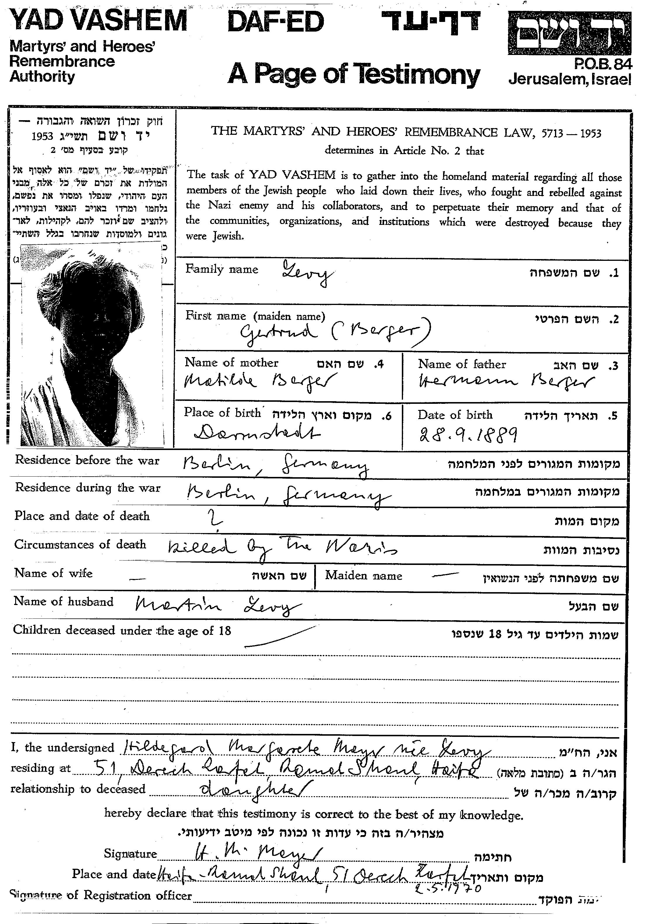 Levy Gertrud 1889 Berlin, Germany Page of Testimony