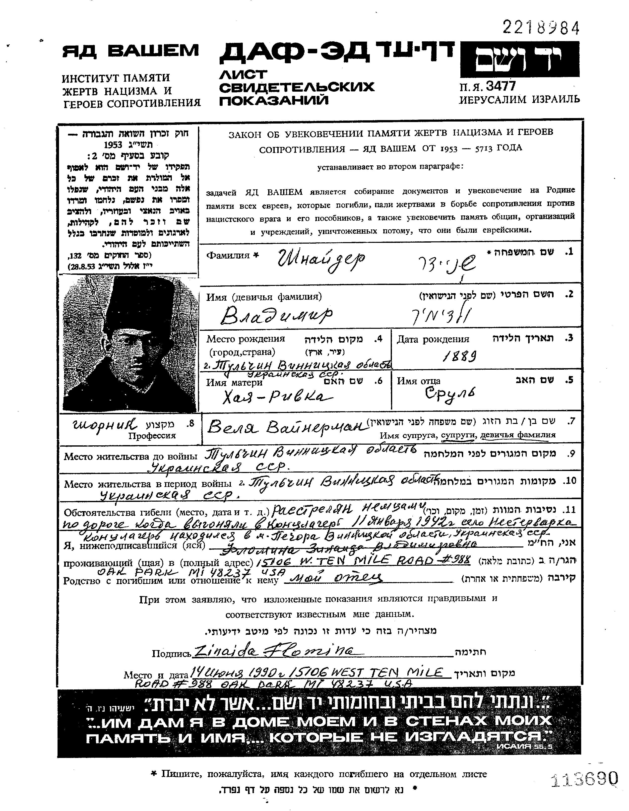 Shnaider Vladimir 1889 Tulchin, Ukraine (USSR) Page of Testimony
