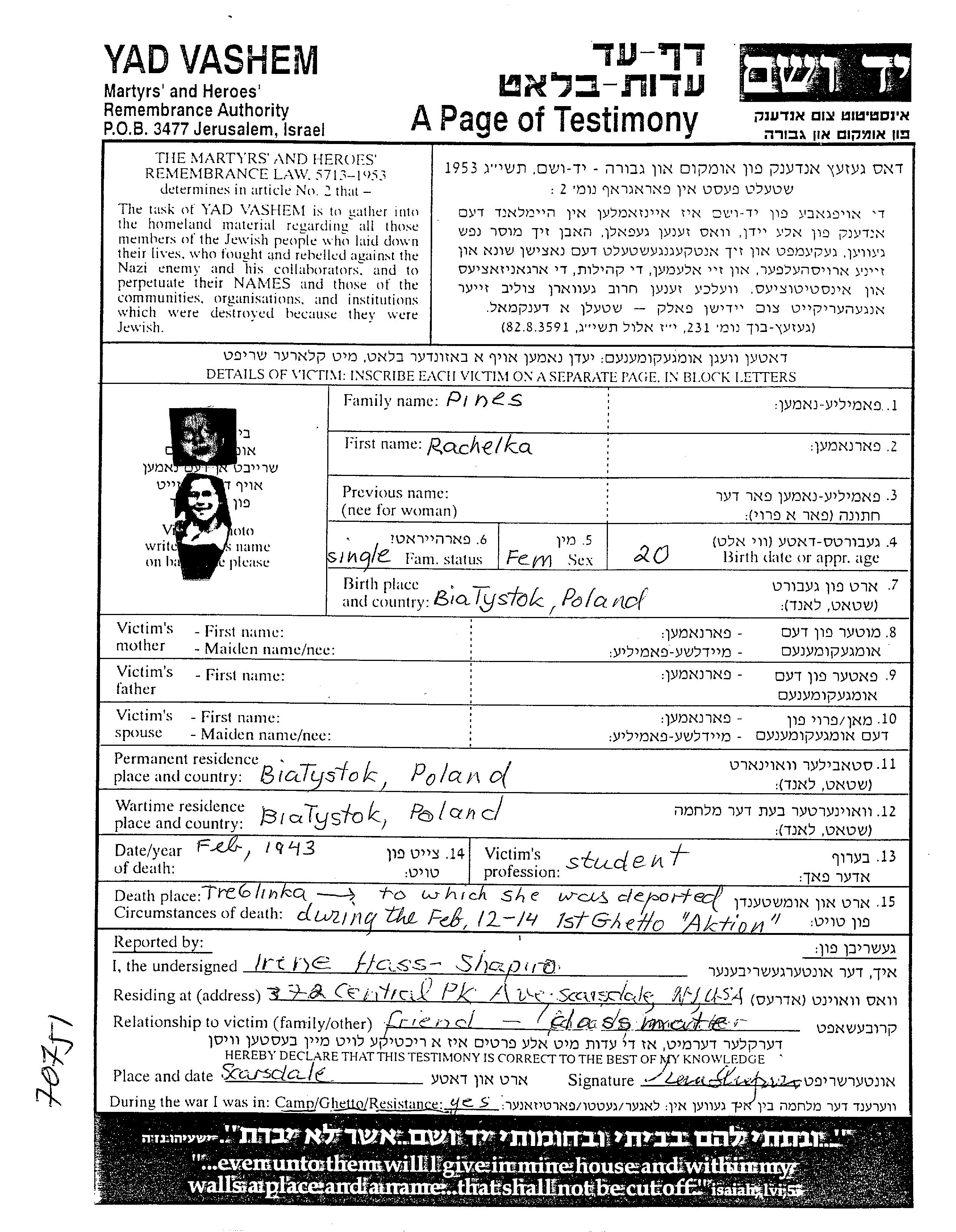 Pines Rachelka Bialystok, Poland Page of Testimony