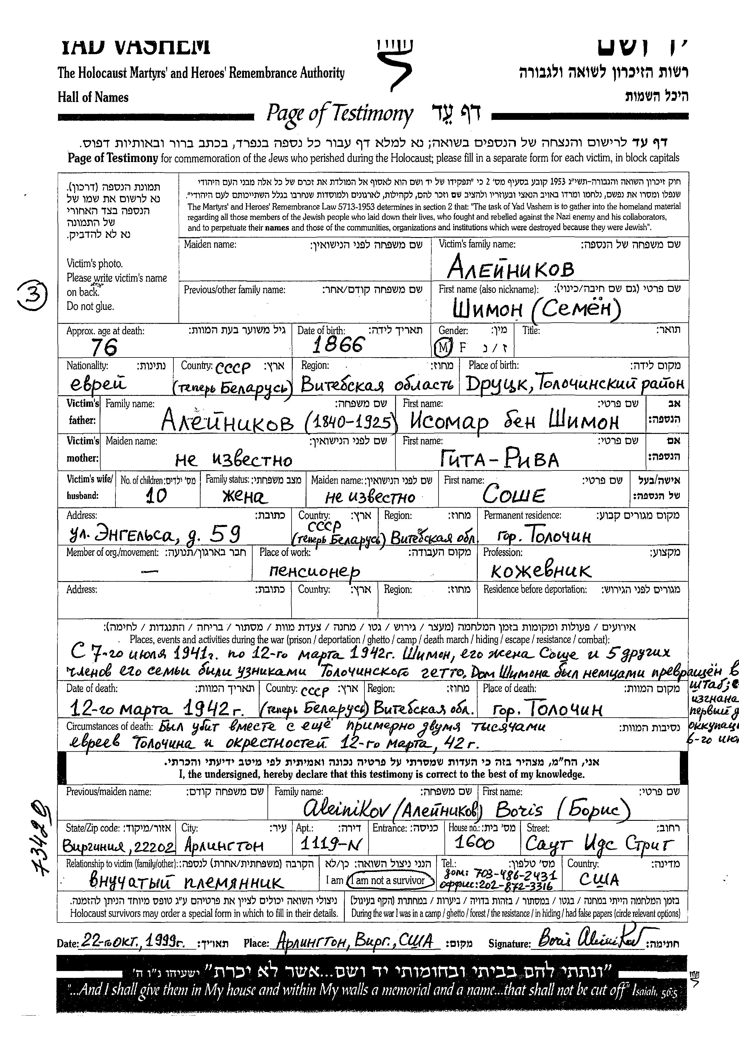 Aleinikov | Shimon | 1866 | Tolochin, Belorussia (USSR) | Page of Testimony |