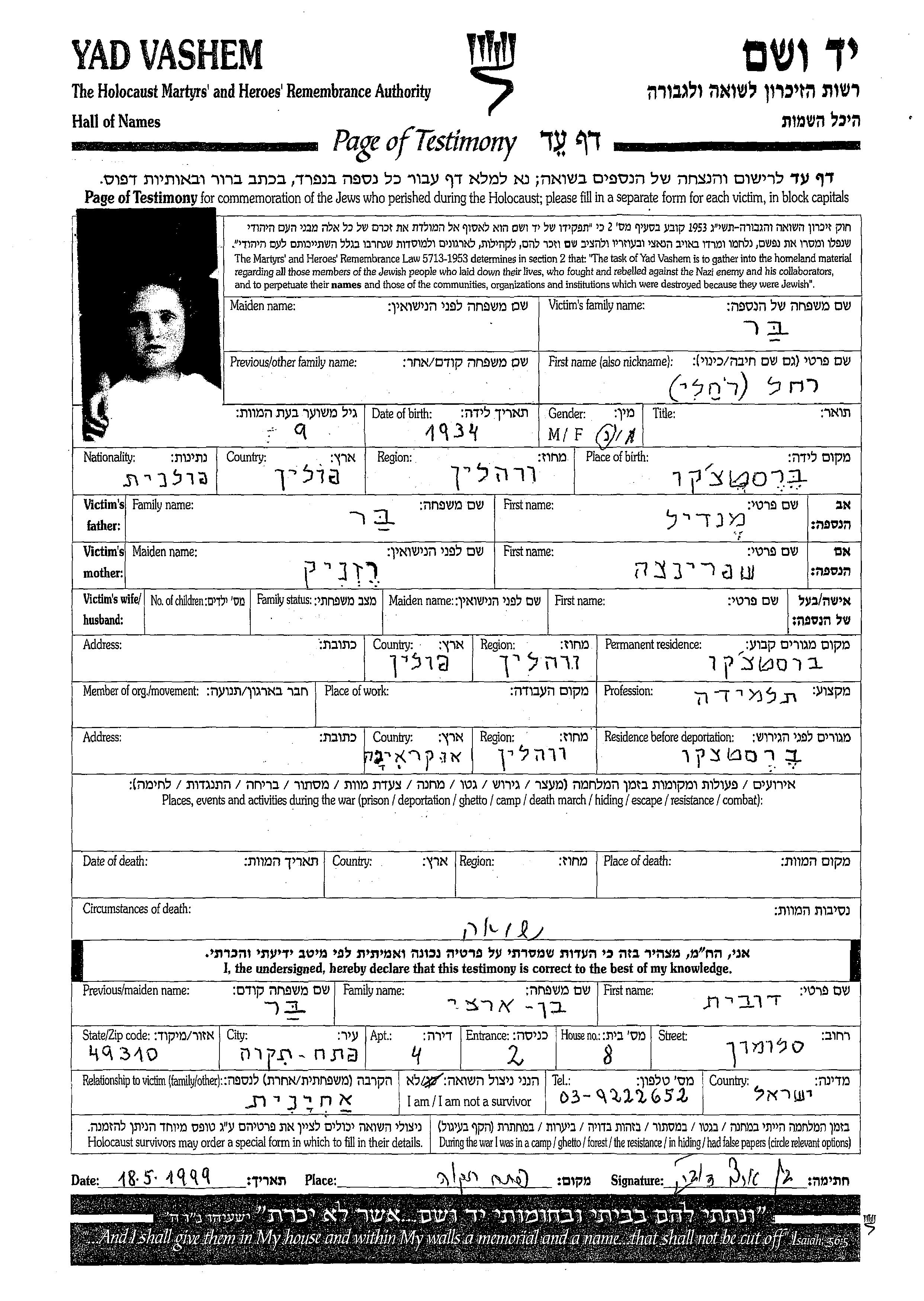 Ber Rakhel 1934 Berestechko, Poland Page of Testimony