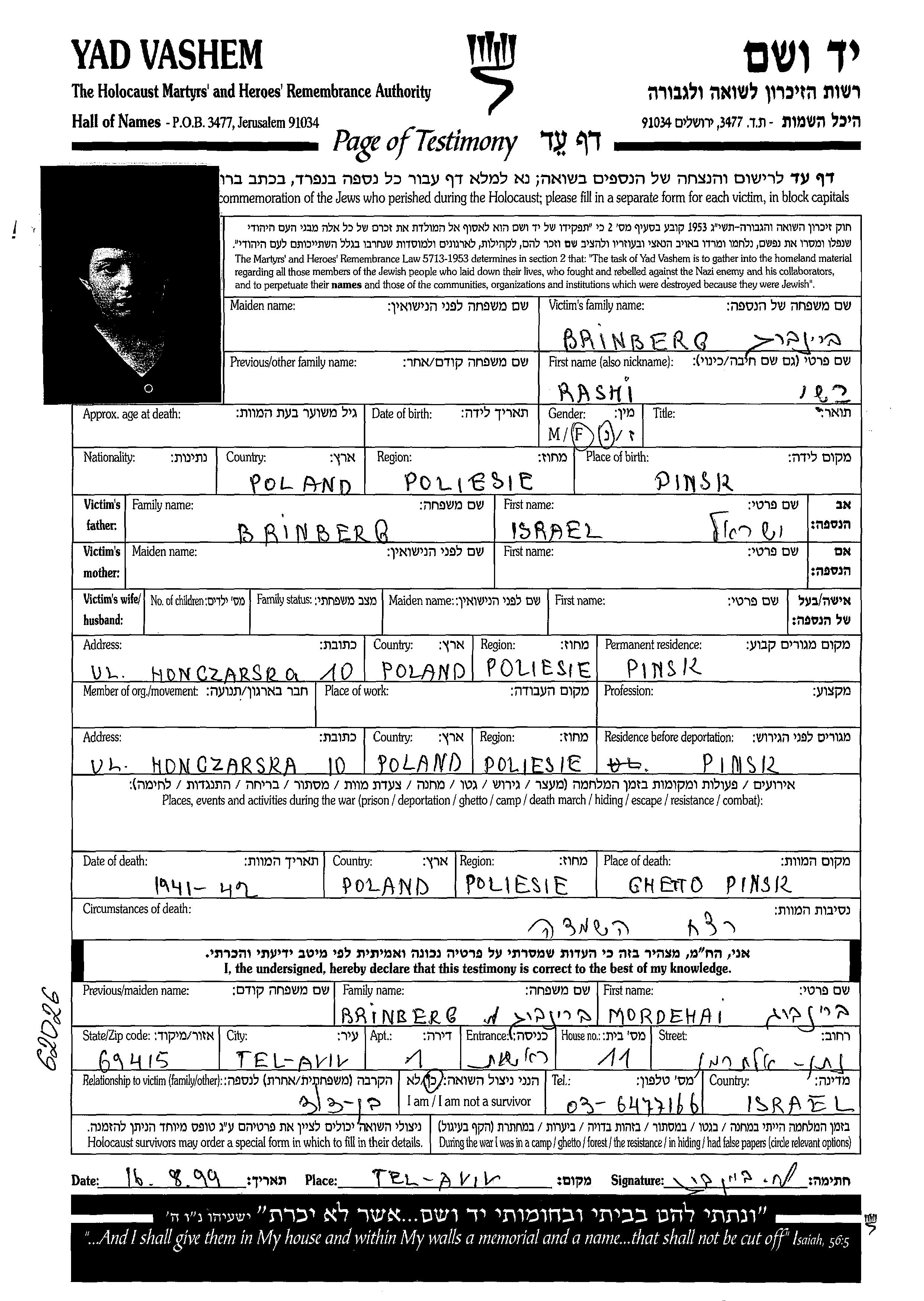Brinberg Rashi Pinsk, Poland Page of Testimony