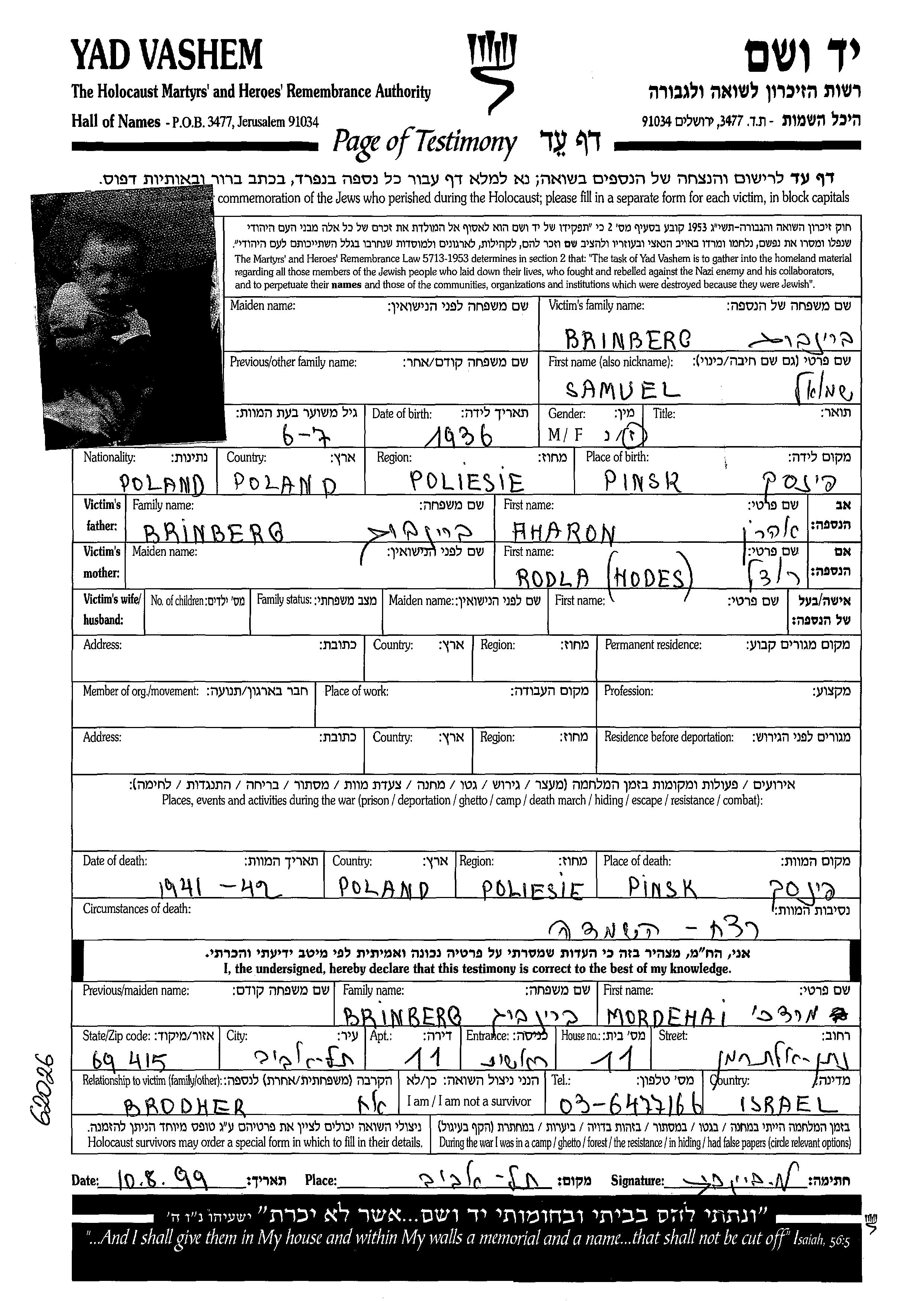 Brinberg Shmuel 1936 unstated place, Page of Testimony