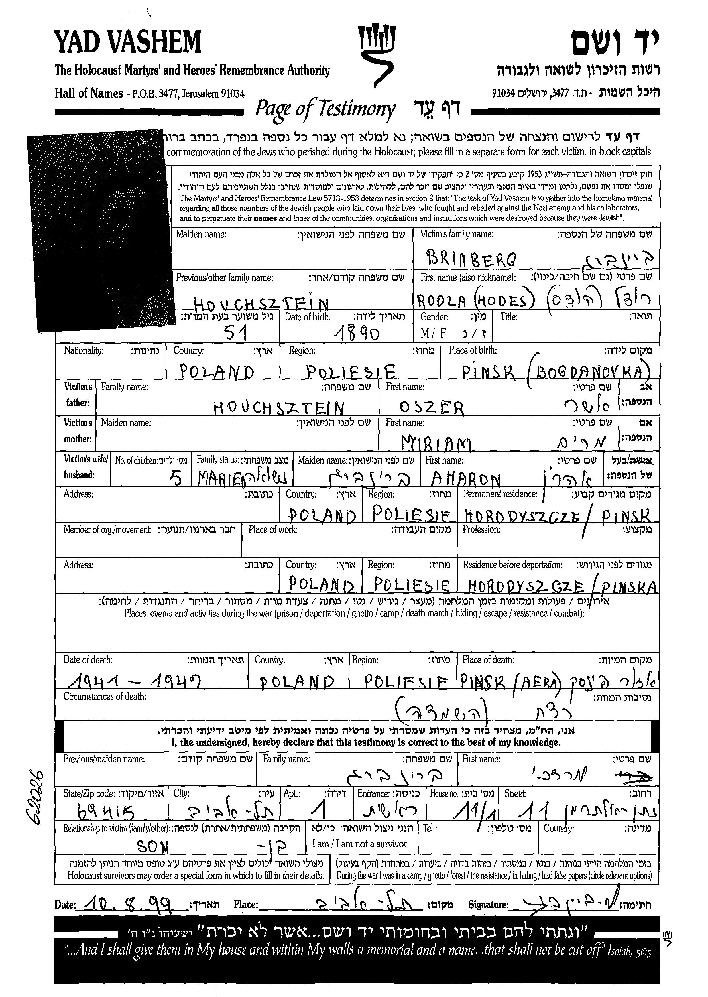 Rodla Hudes Rudel Brinberg was born in Pinsk, Poland, 1890. Prior to WWII she lived in Horodyszcze, Poland. Rodla Hudes Rudel was murdered in the Shoah. Place of death: Pinsk, Poland, 1941.