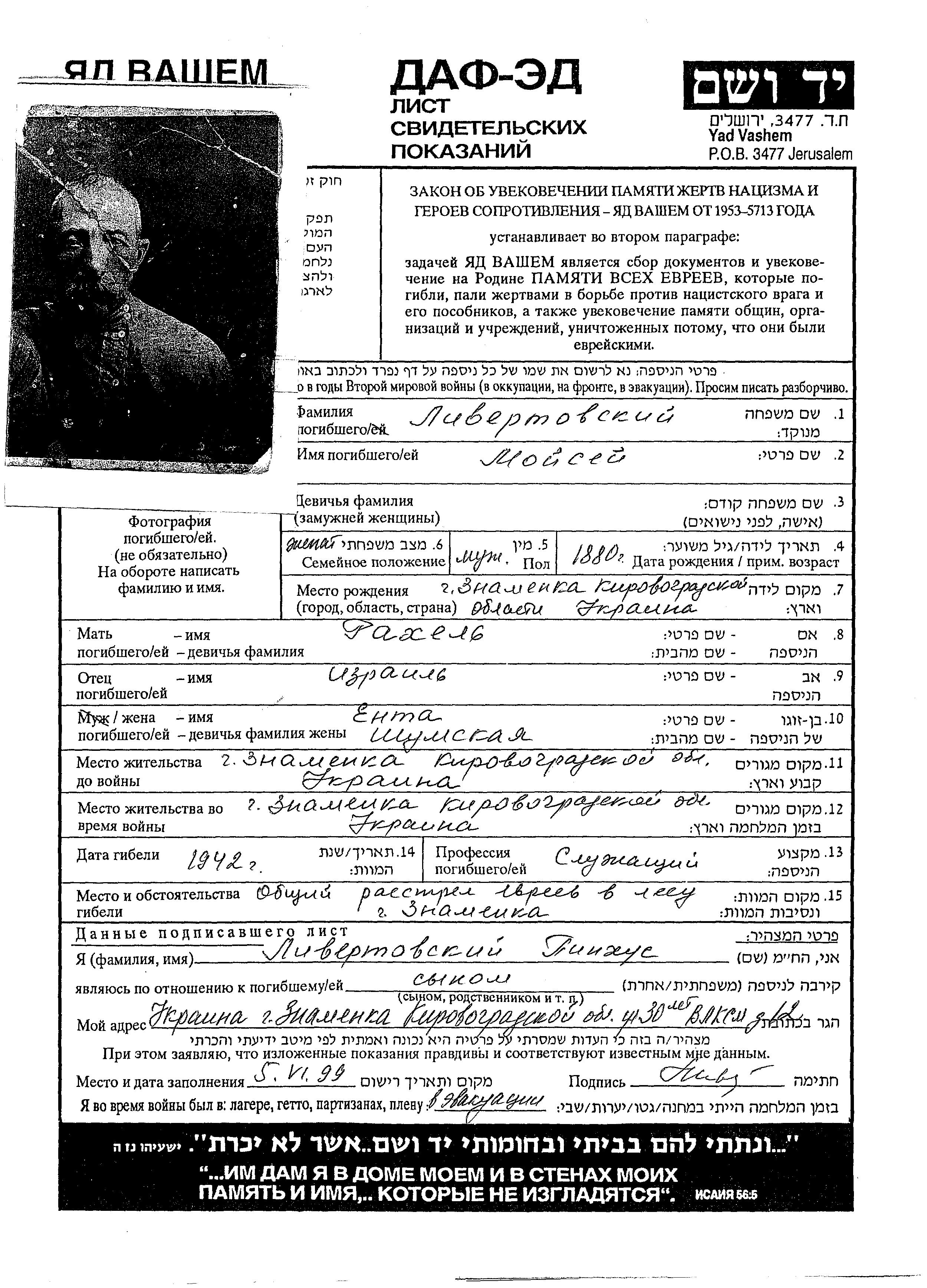 Moisei Livertovski was born in Znamenka, Ukraine (USSR), 1880. He was an employee. Prior to WWII he lived in Znamenka, Ukraine (USSR). Moisei was murdered in the Shoah. Place of death: Znamenka, Ukraine (USSR), 1942.