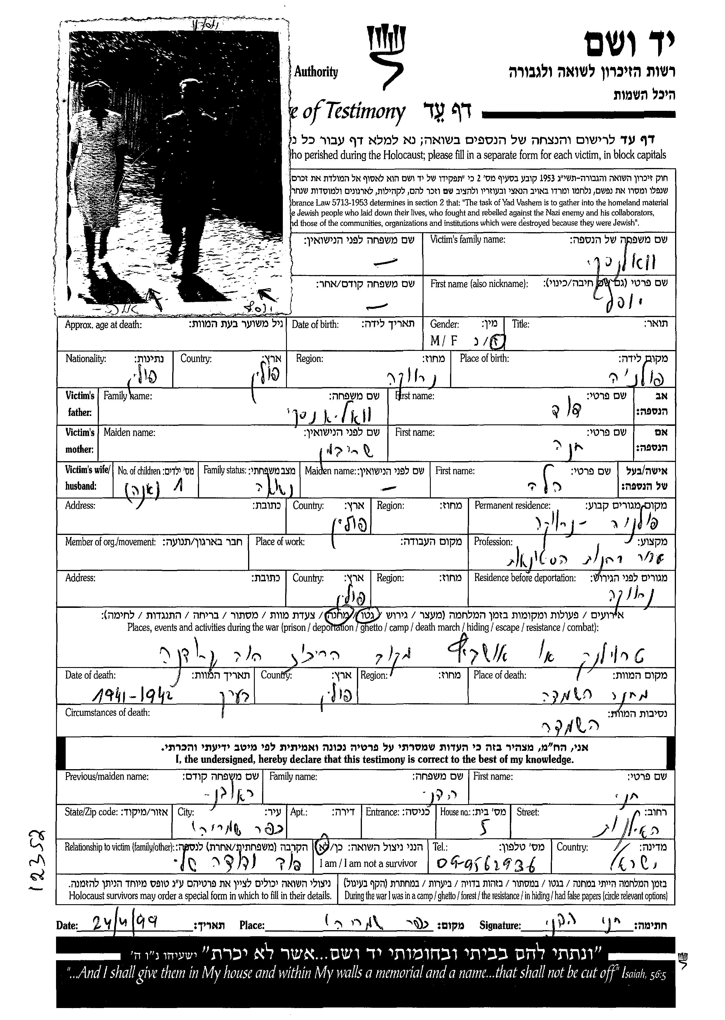 Yosef Valenski was born in Narewka Mala, Poland. He was a merchant. Prior to WWII he lived in Narewka Mala, Poland. Yosef was murdered in the Shoah. Place of death: Camp, Poland, 1942.