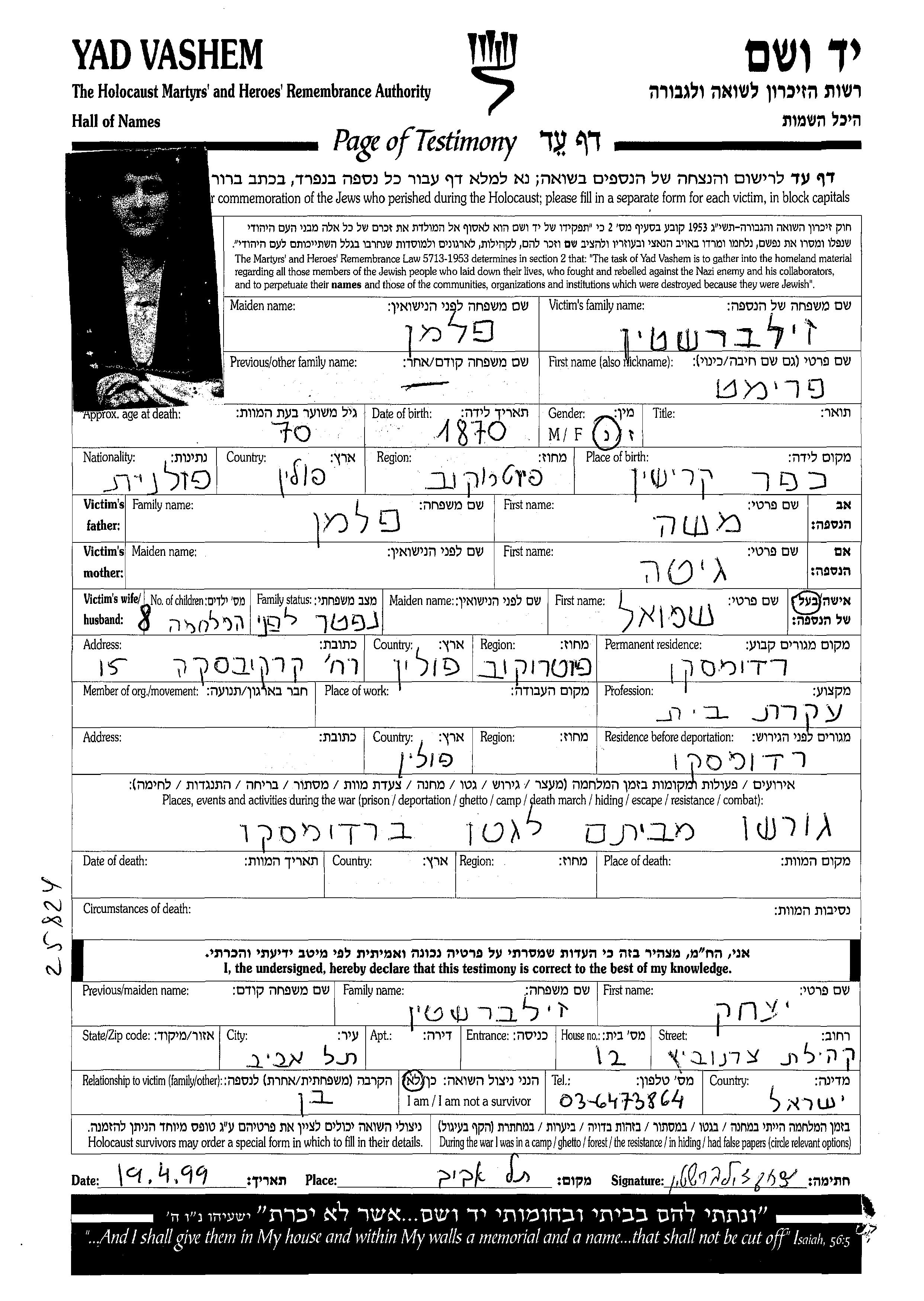 Frimet Zilbershtein nee Felman was born in Kruszyna, Poland, 1870. She was a housewife. Prior to WWII she lived in Radomsko, Poland. Frimet was murdered in the Shoah. Place of death: unstated place.