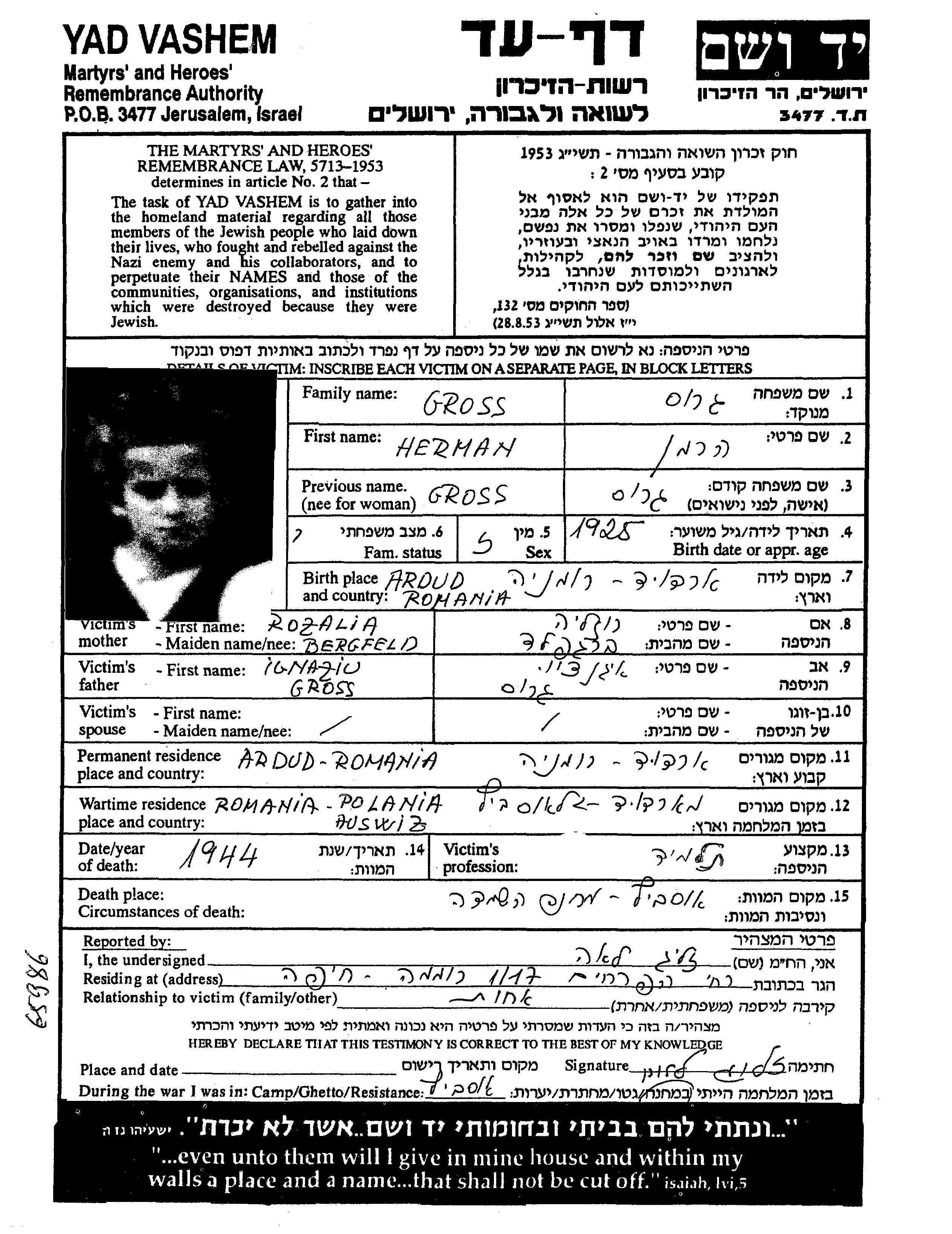 Gross Herman 1925 Ardud, Romania Page of Testimony