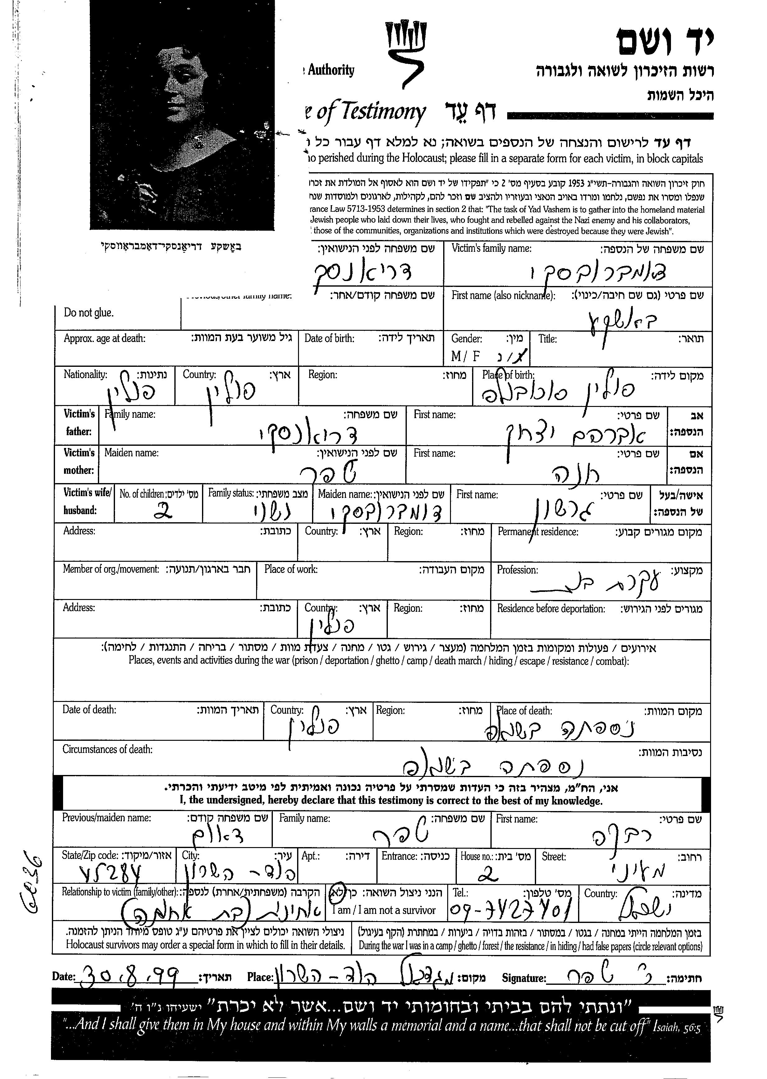 Dombrovski Bashke unstated place, Page of Testimony
