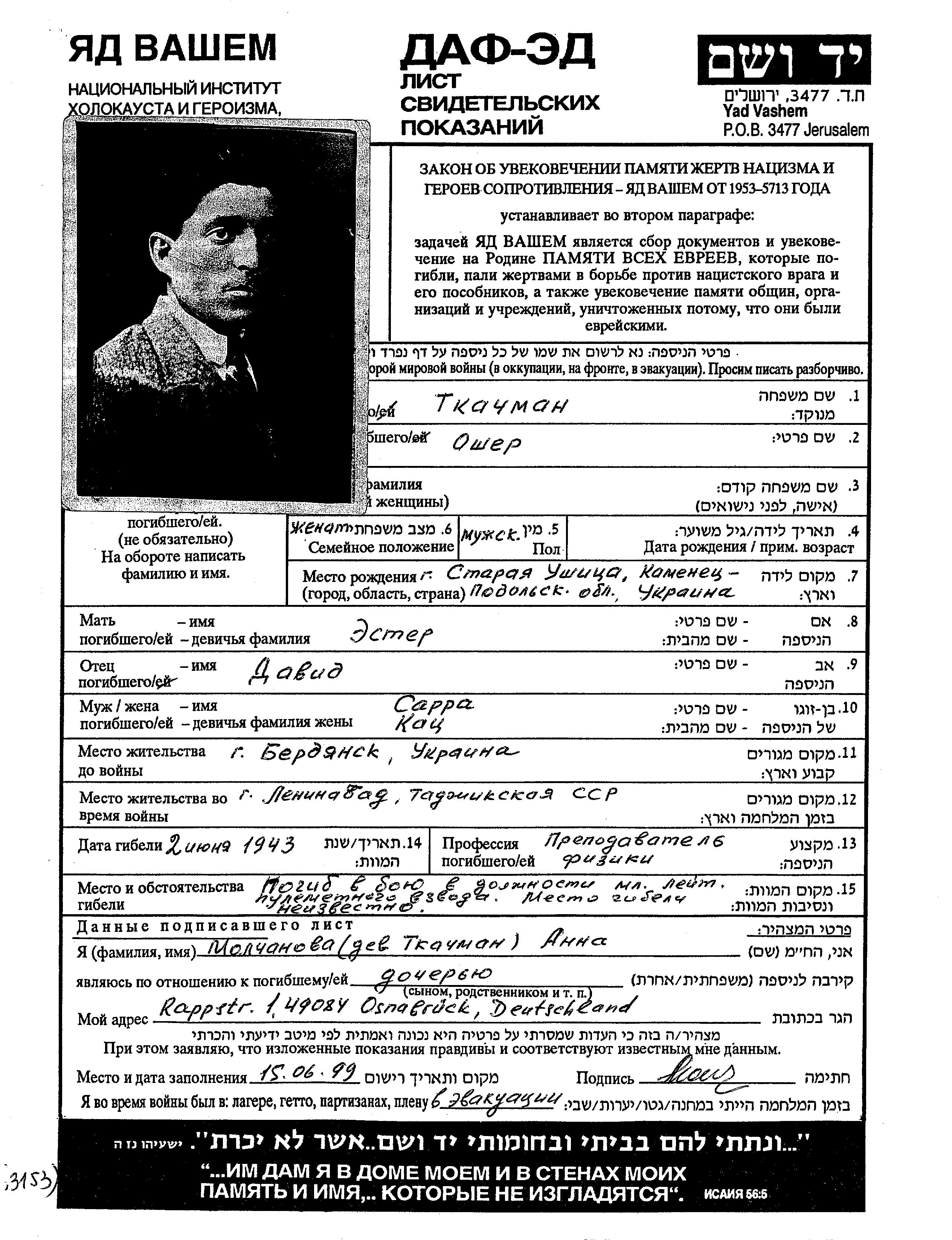 Osher Tkachman was born in Staraya Ushitsa, Ukraine (USSR). He was a teacher. Prior to WWII he lived in Osipenko, Ukraine (USSR). Osher was murdered in the Shoah. Place of death: unstated place, 1943.